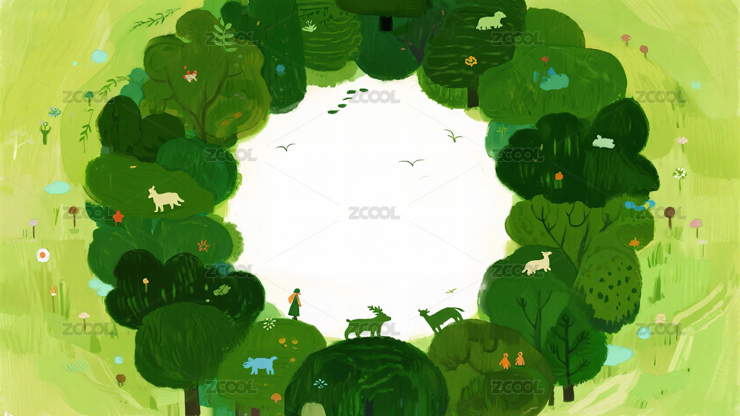 森林环绕空地上的动物与人物