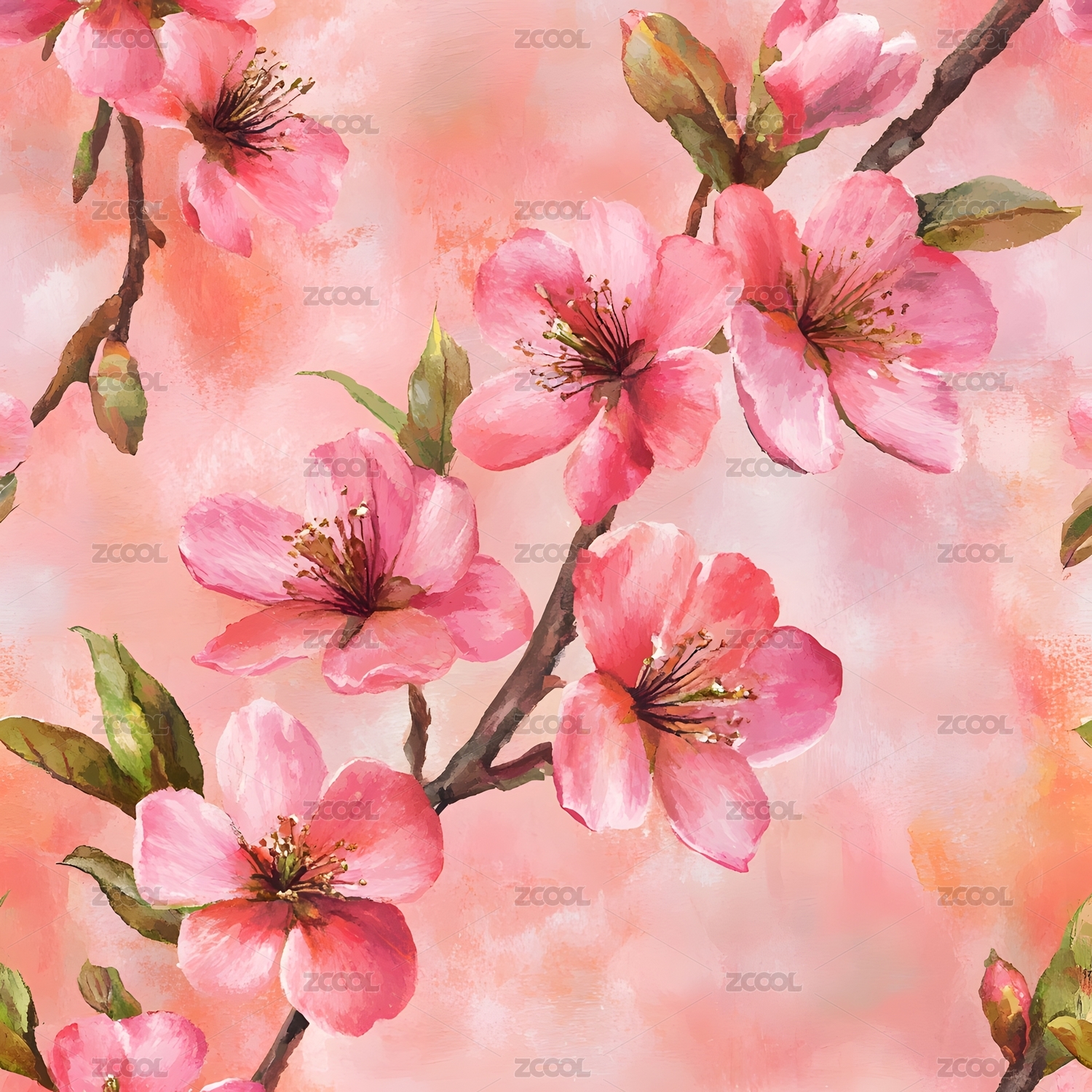 蓝色背景油画风格盛开桃花四方连续家纺图案