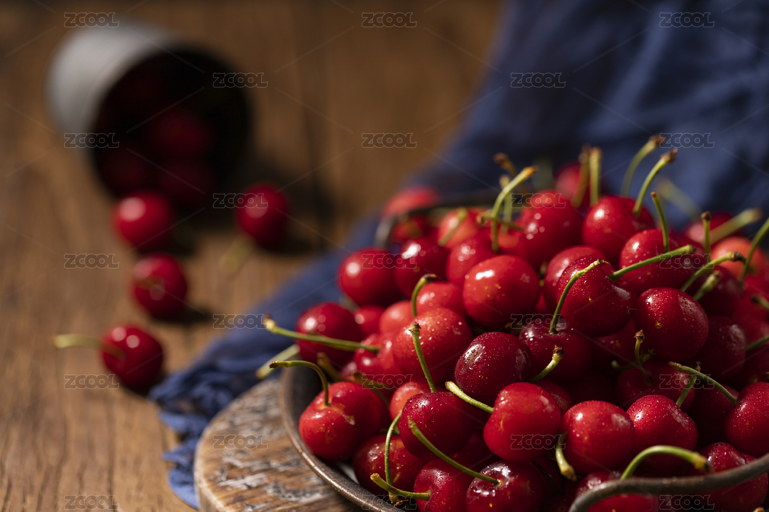 浅色木桌上放着一碗新鲜诱人的大樱桃