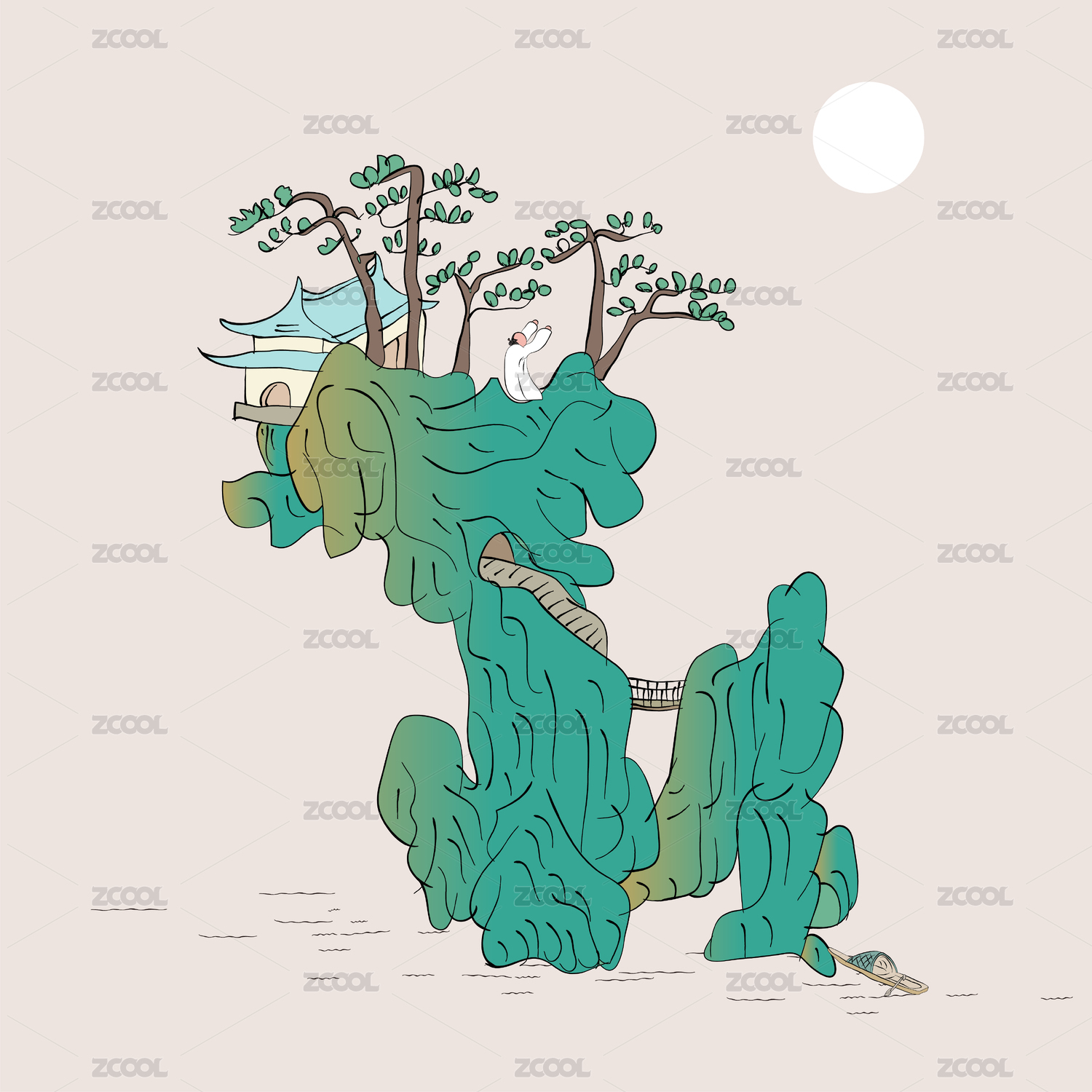海浪鲤鱼仙鹤松树国潮风插画背景图