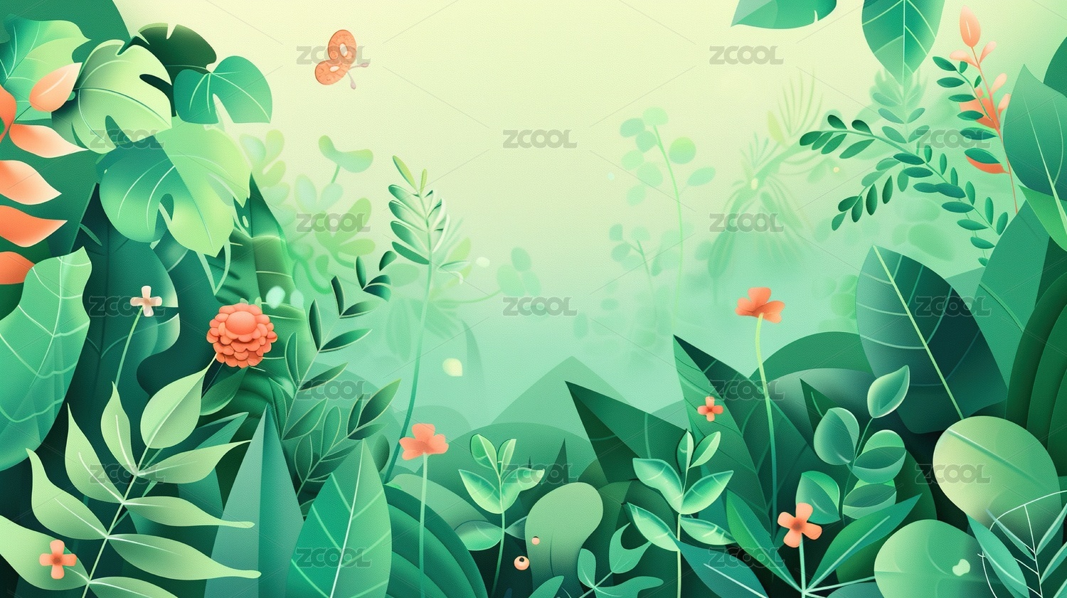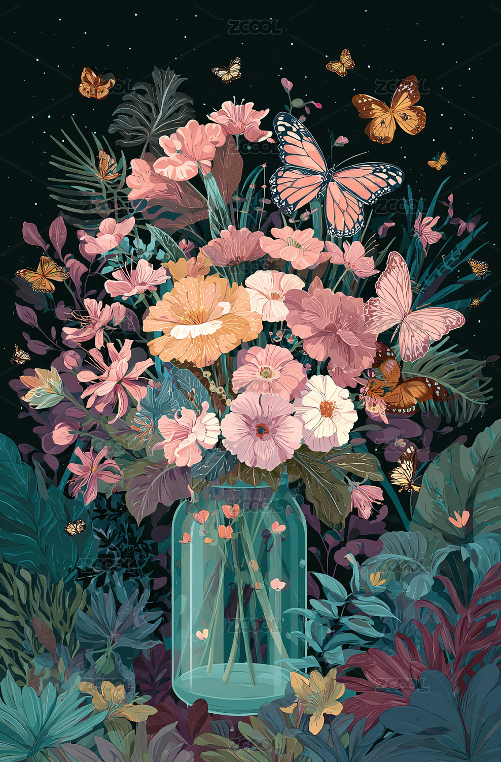 绿色,瓶子,金鱼,蝴蝶,植物,女孩,春天,希望,童话,插画