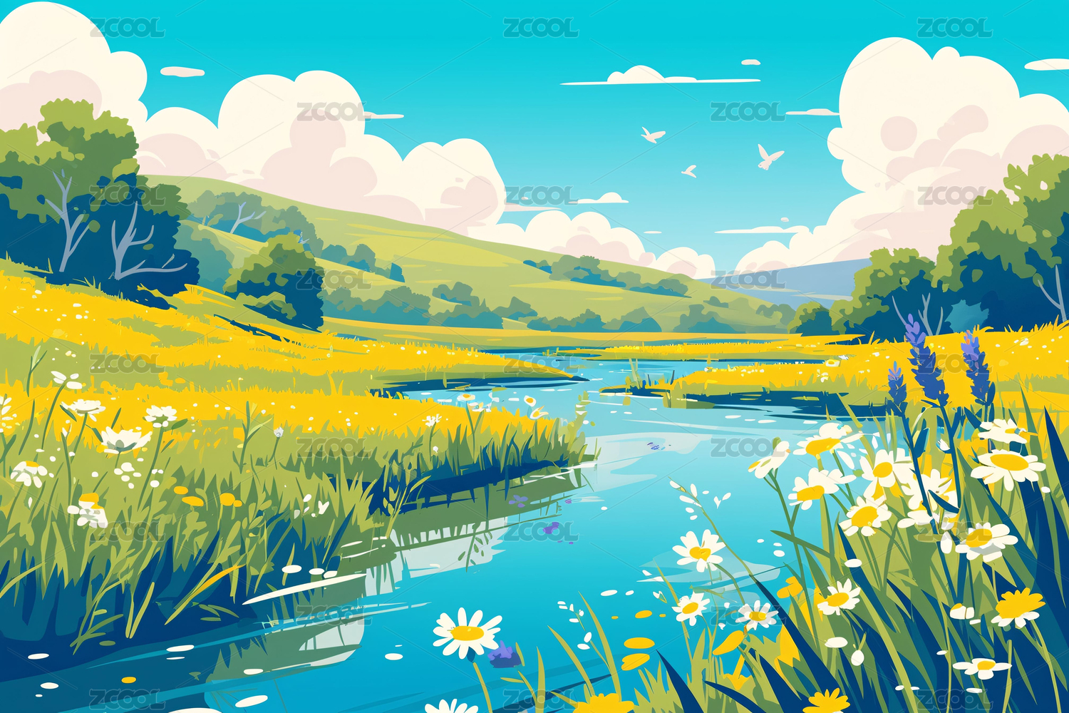 夏天河流风景插画小暑节气户外旅行概念插图