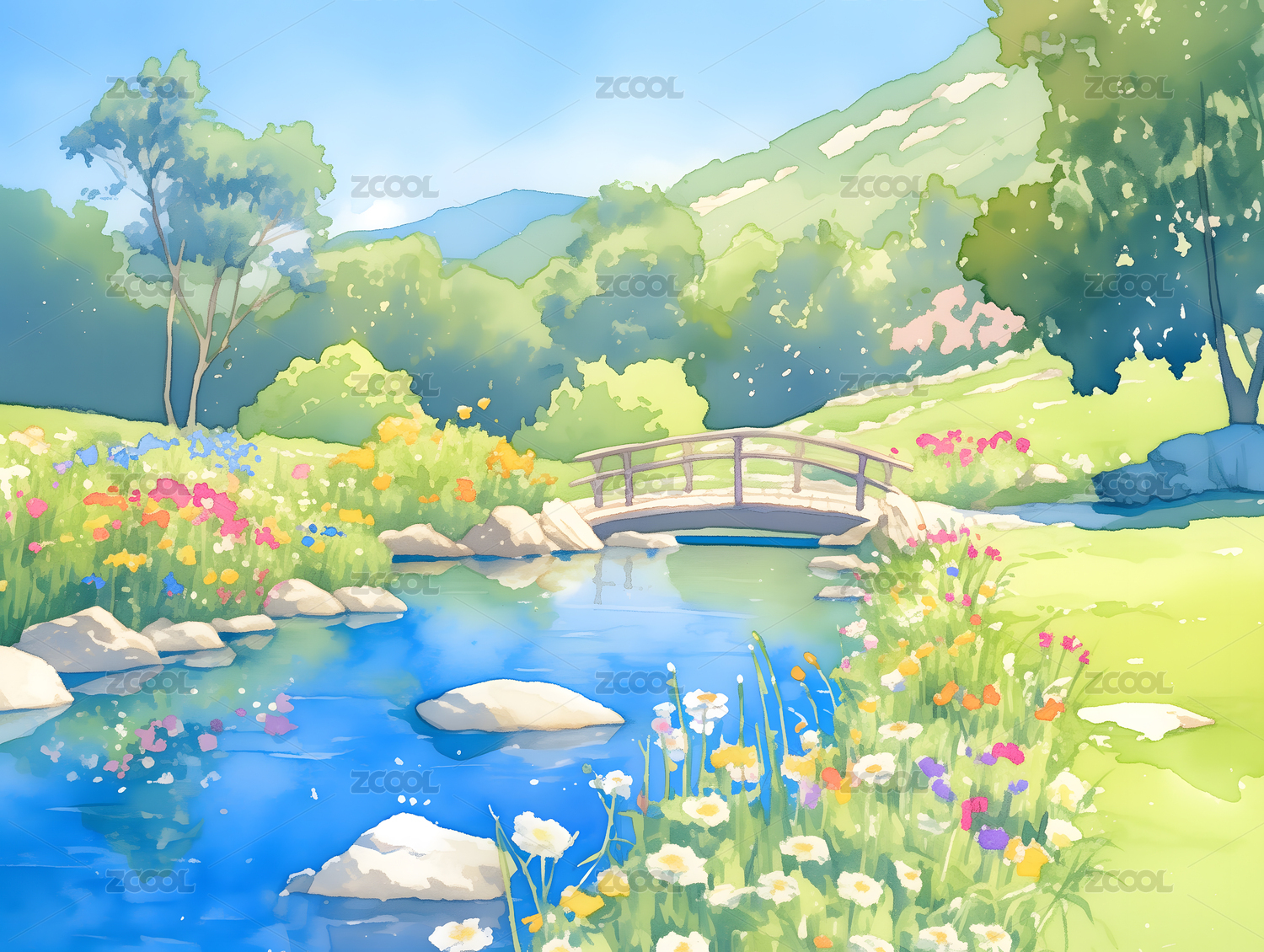 水彩画山涧溪流