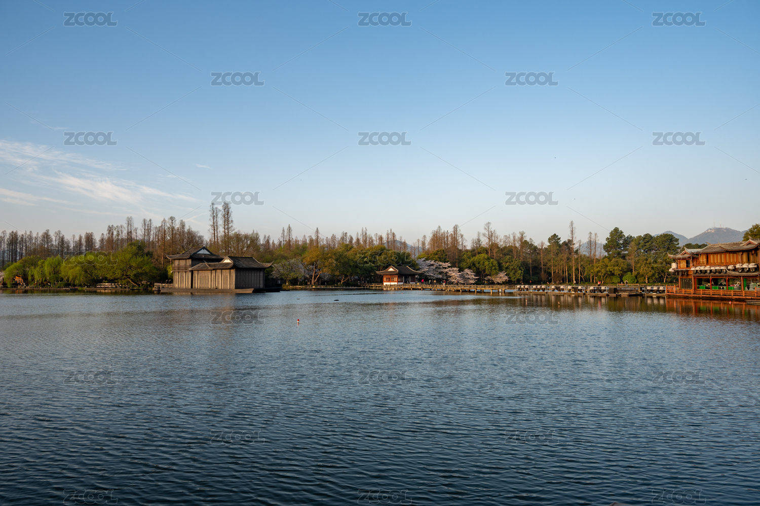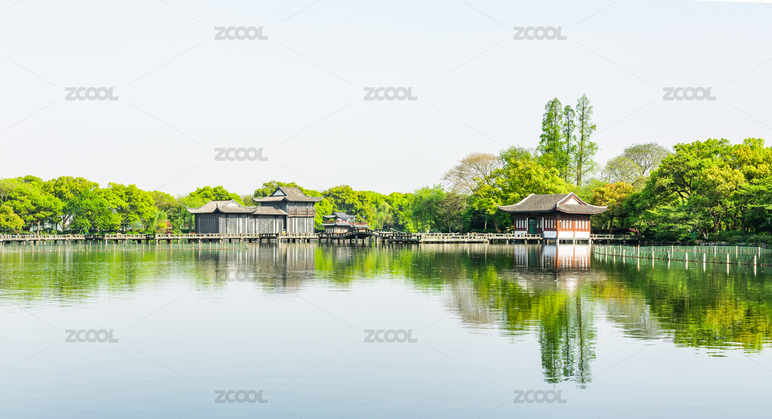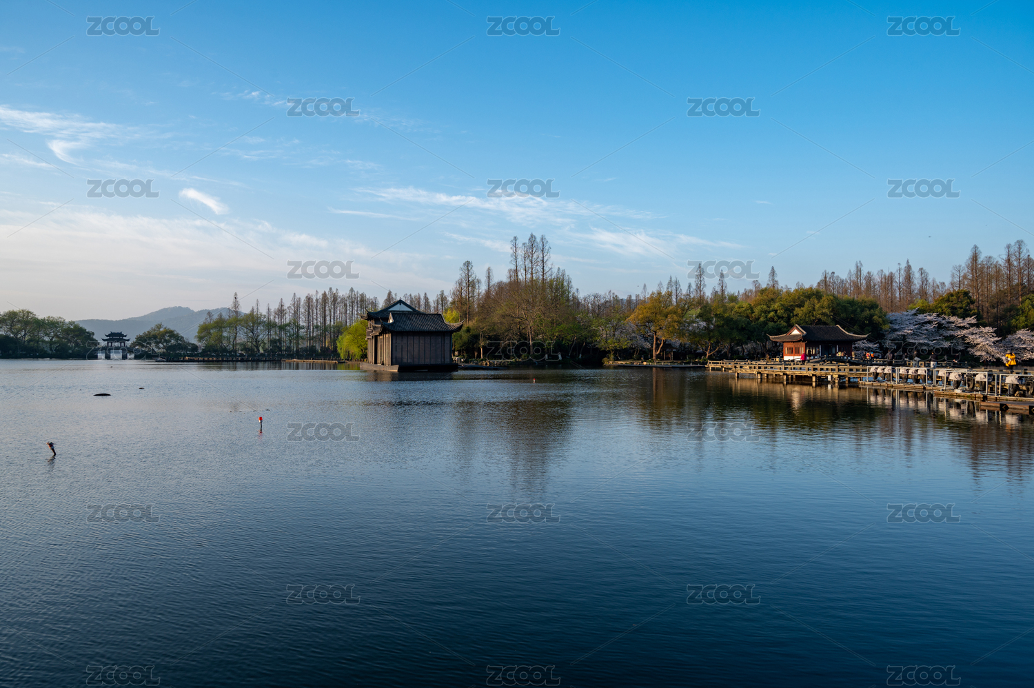 中国杭州西湖花港观鱼碧空映衬下的湖景