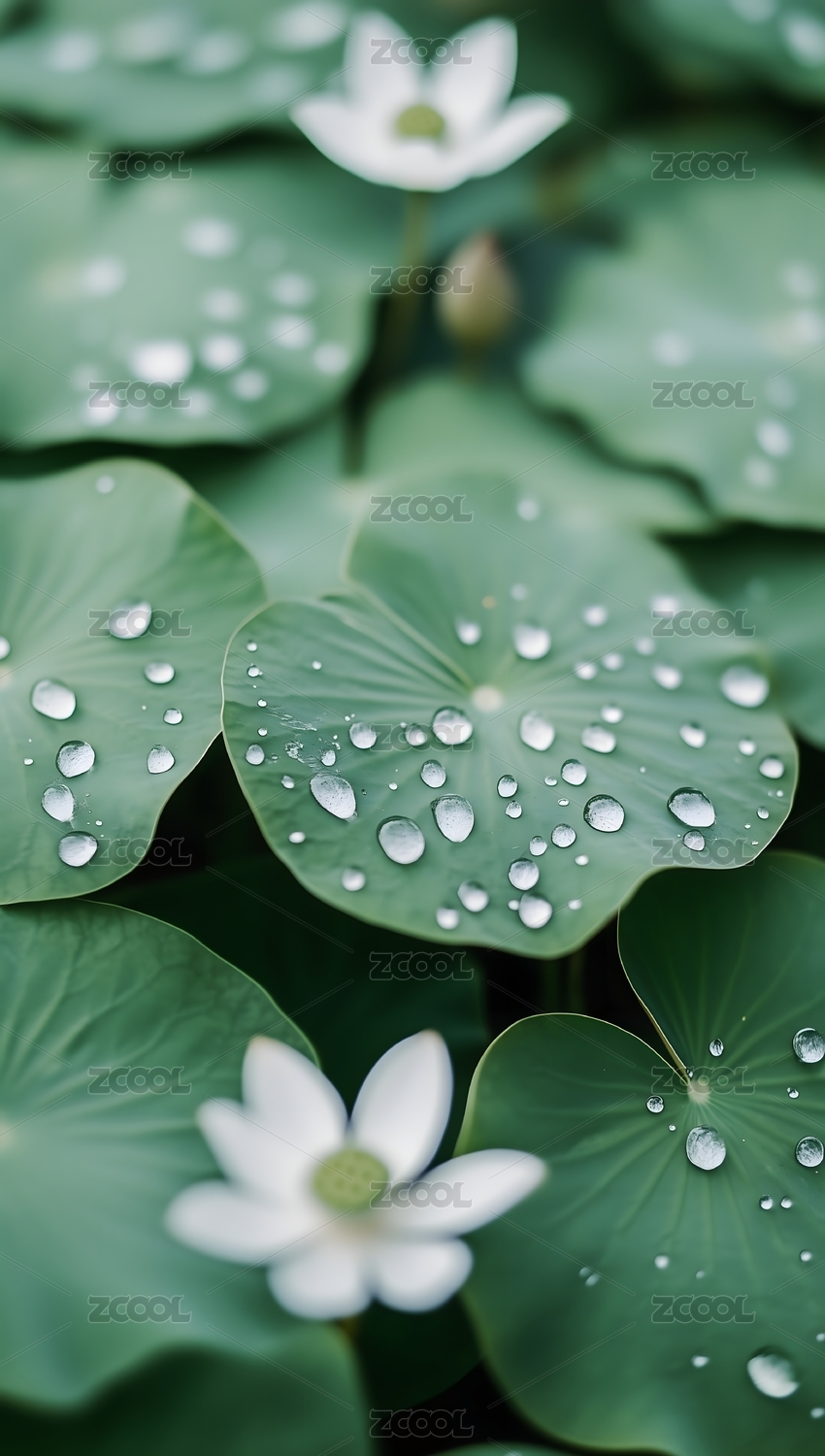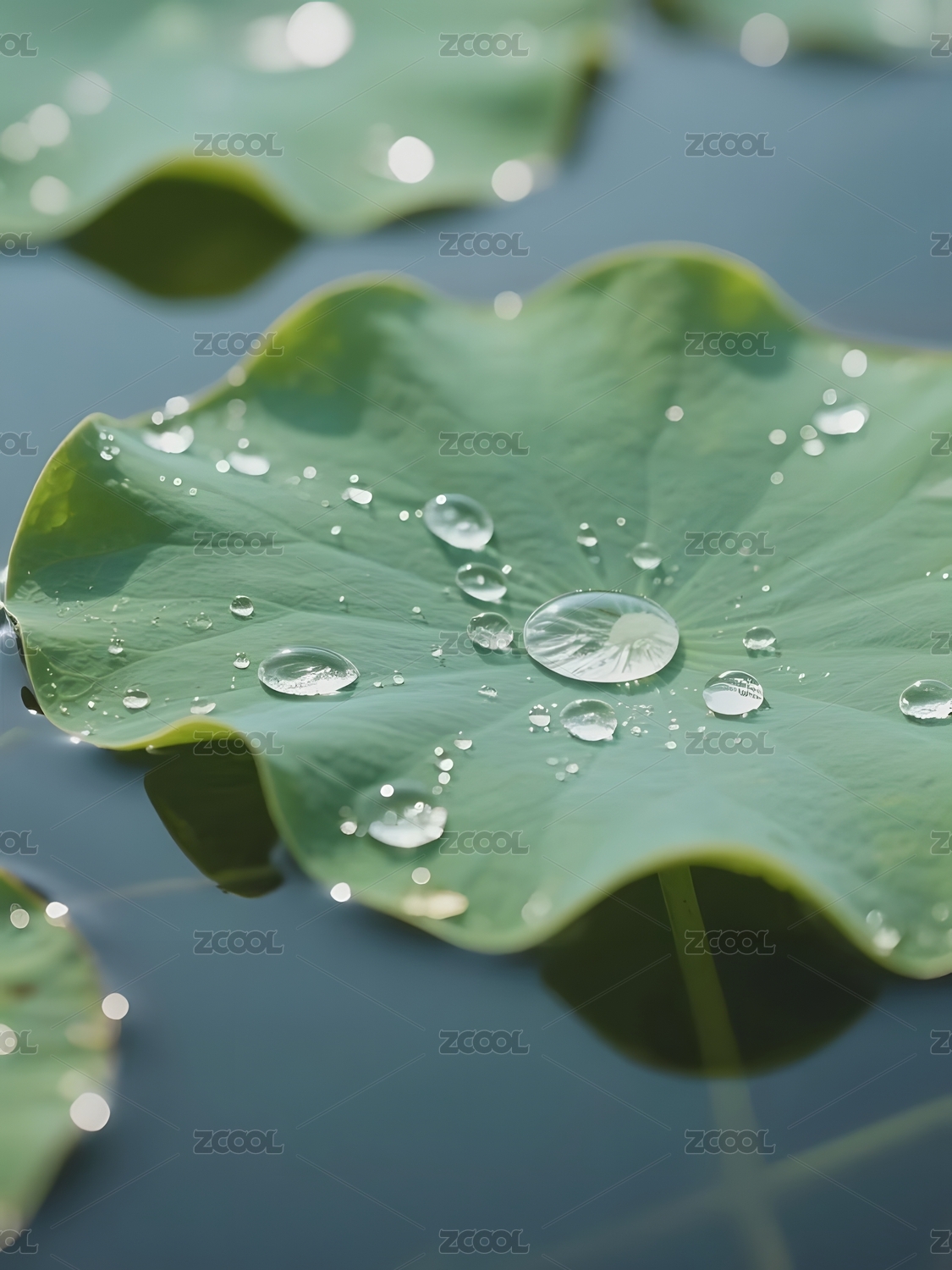 晶莹露珠点缀翠绿荷叶的静谧美景