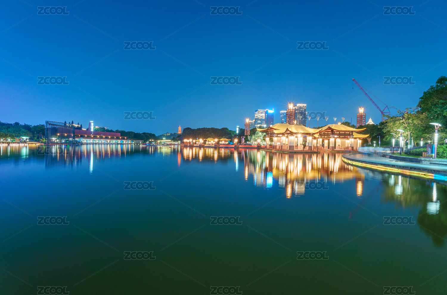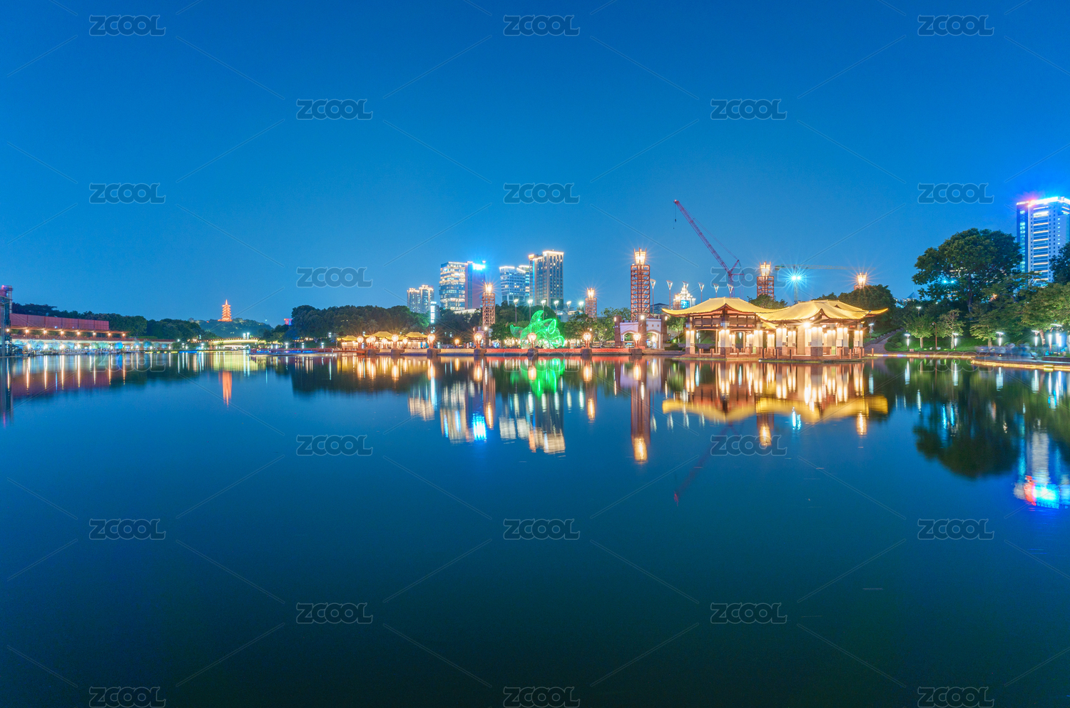 佛山千灯湖公园传统亭台楼阁与城市建筑夜景