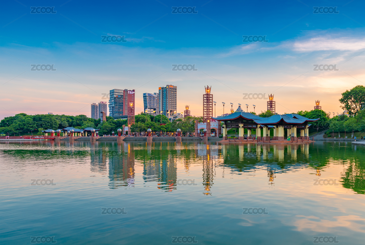 南宁狮山公园湖泊树林景观与夕阳晚霞