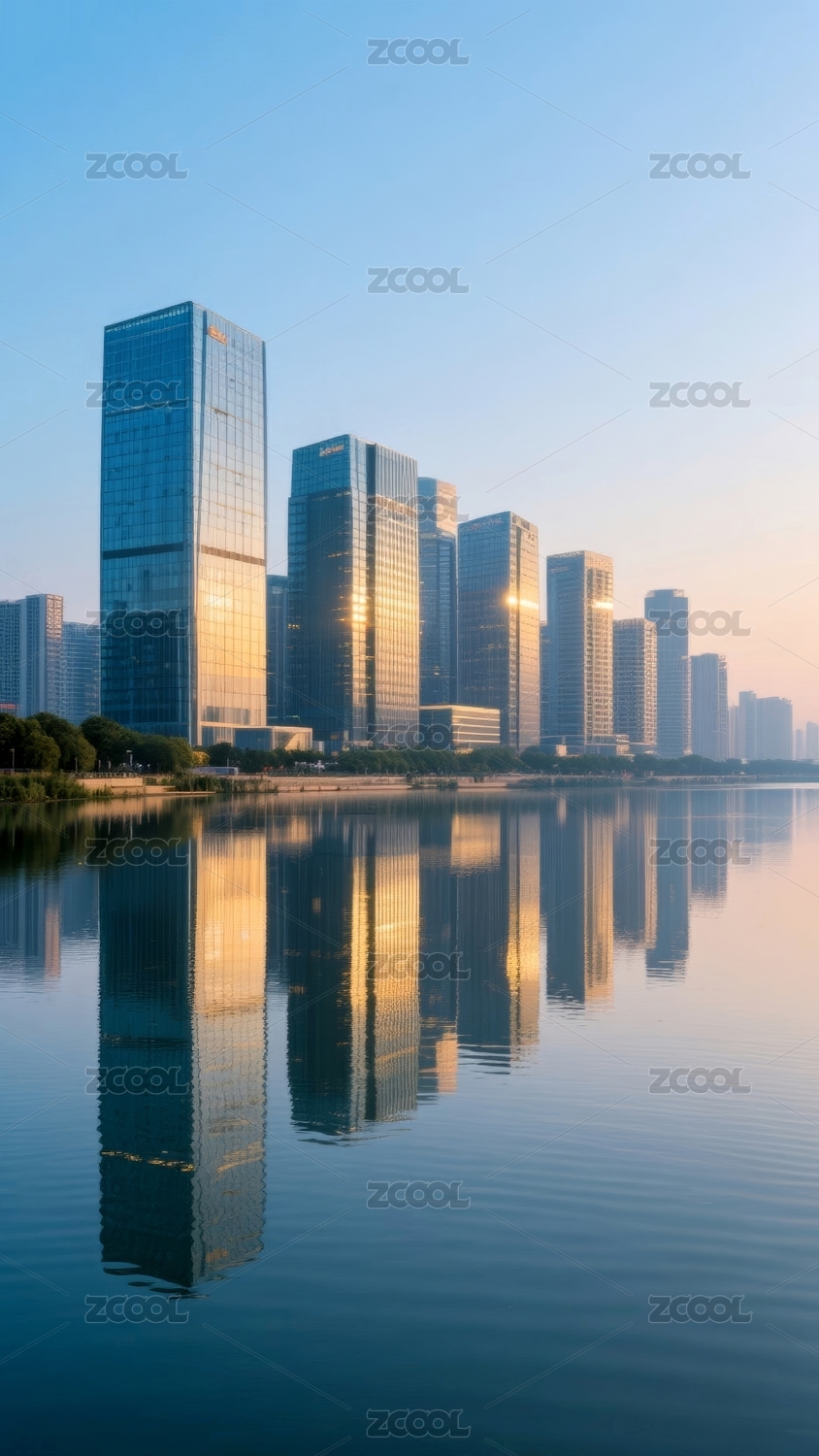 城市建筑倒映湖畔场景
