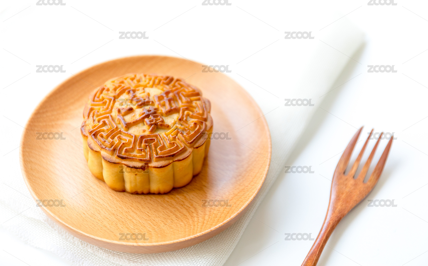 白色背景中一个五仁蛋黄月饼和一把木叉子