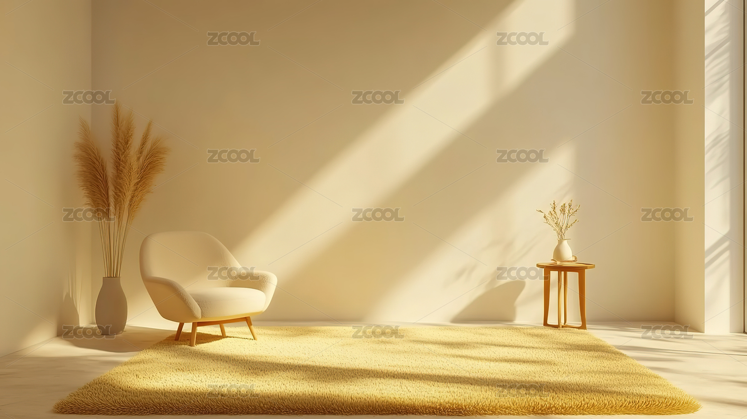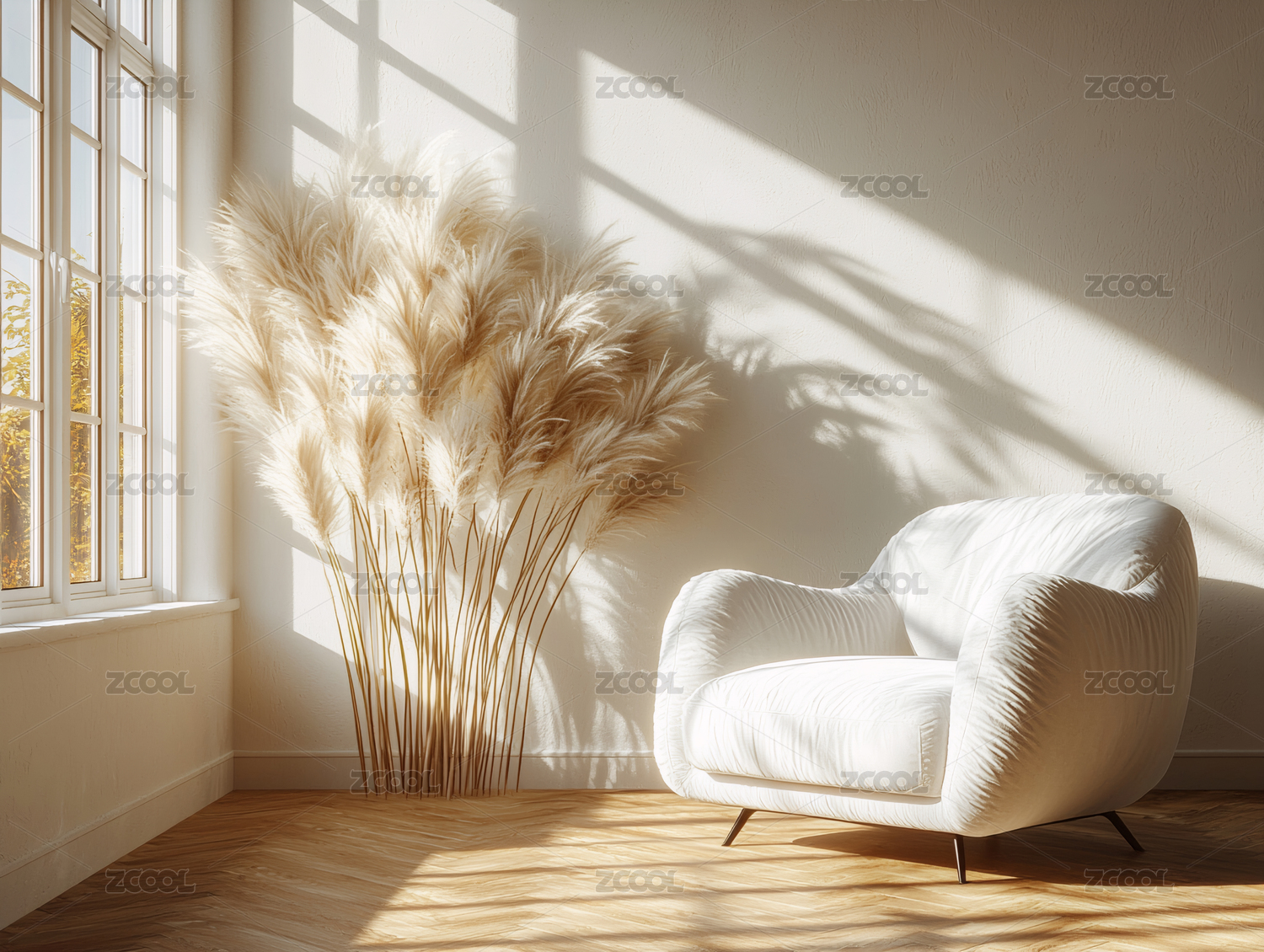 白色室内空墙面与混凝土地板有扶手椅与日光