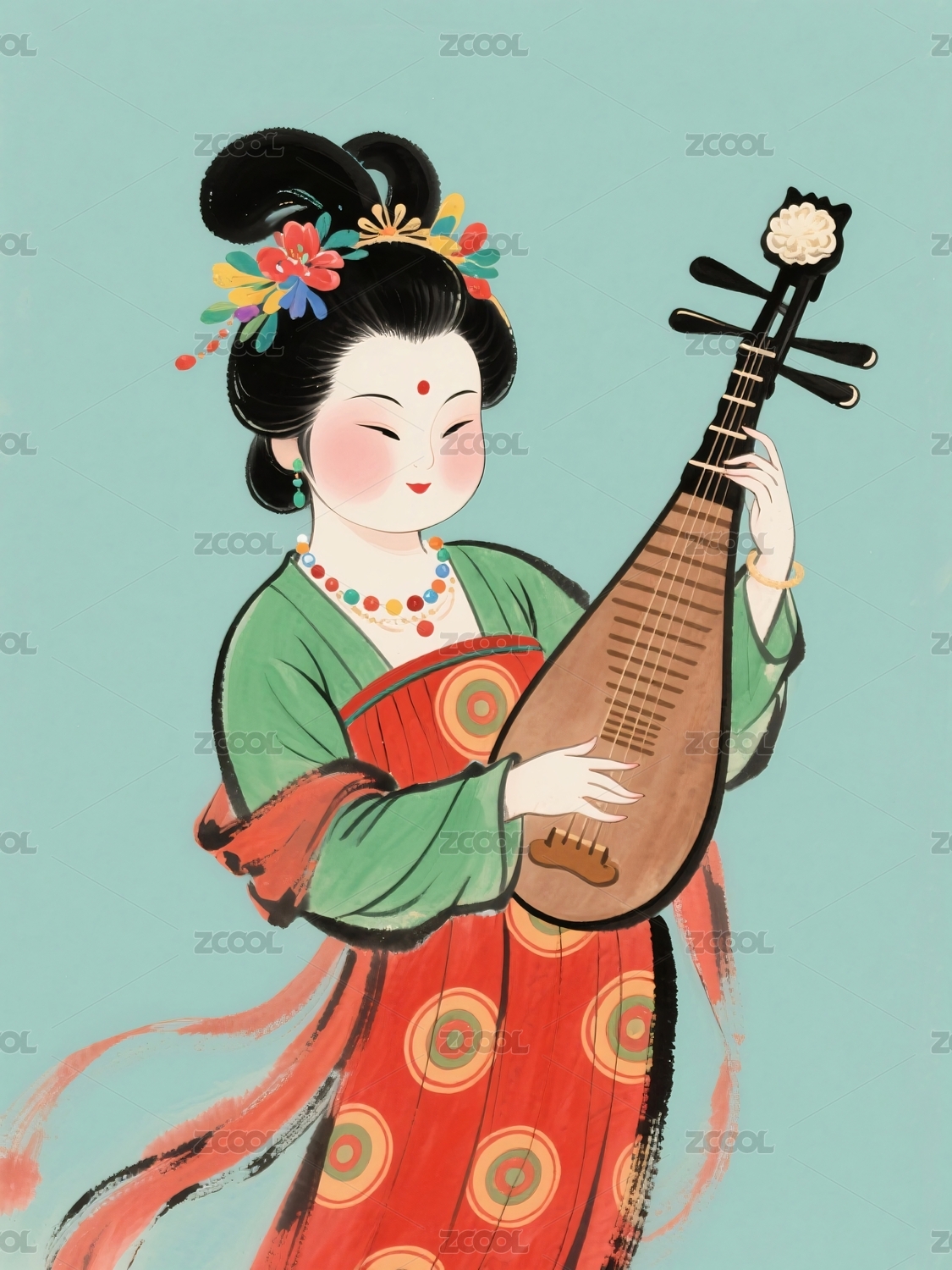 女子演奏琵琶衣着红绿古风