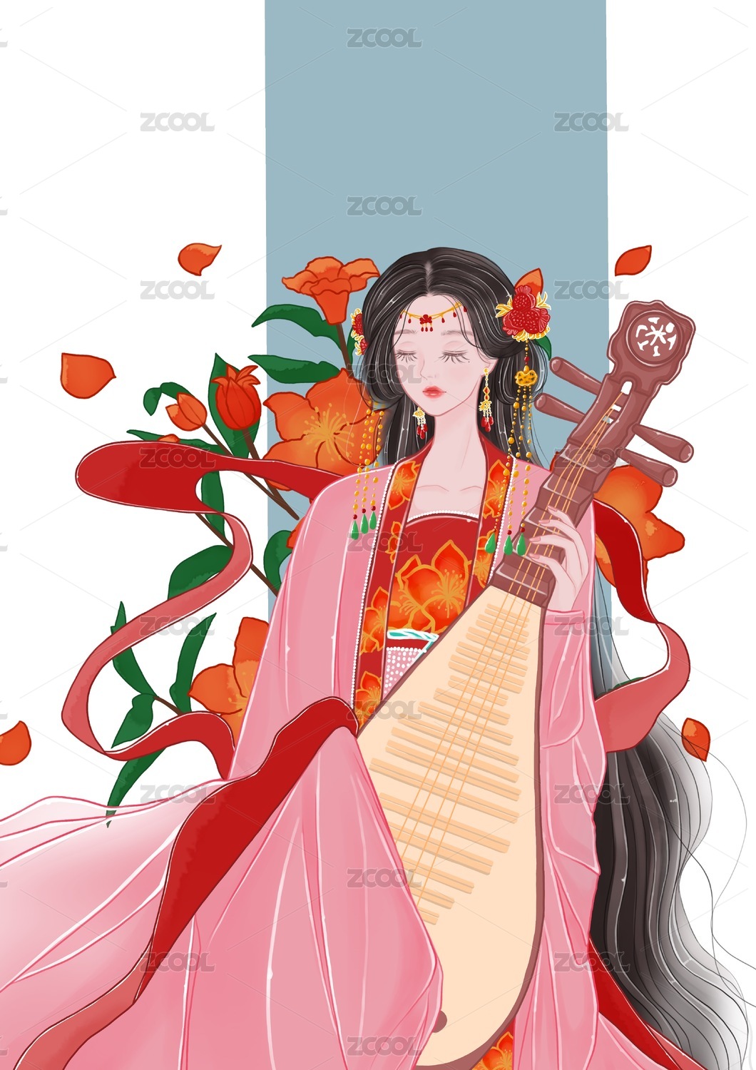 女古装插画人物乐器