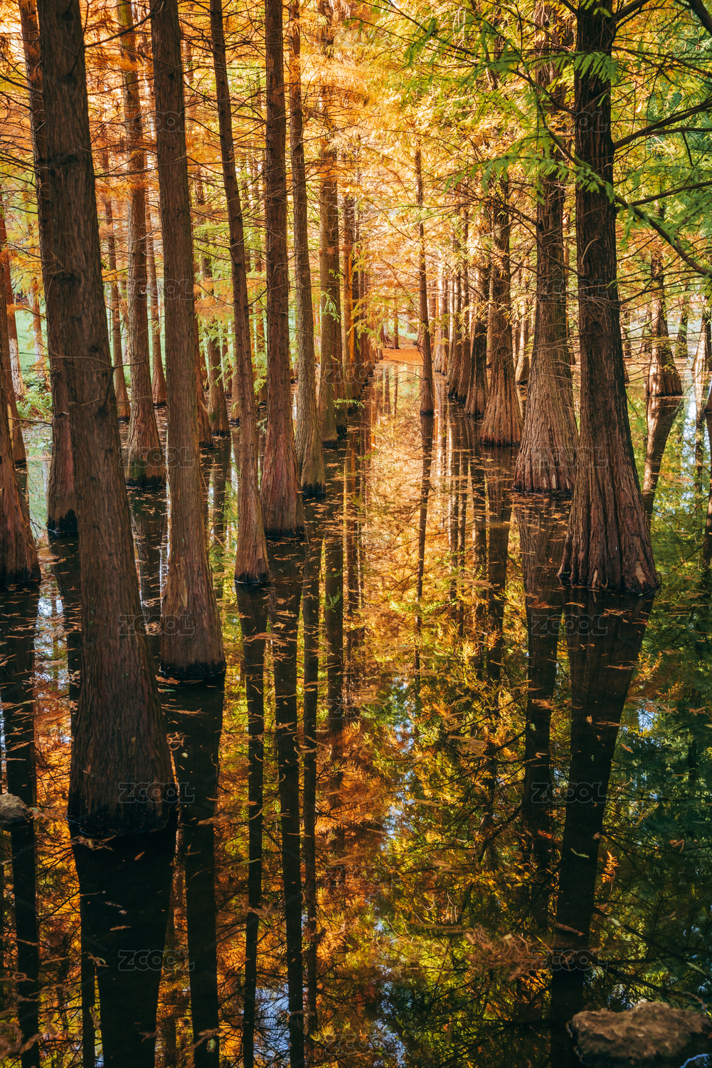 江苏南京明孝陵燕雀湖金秋水杉林倒影