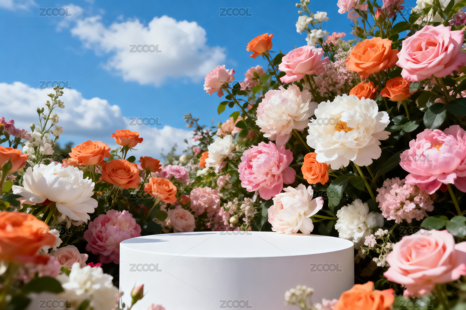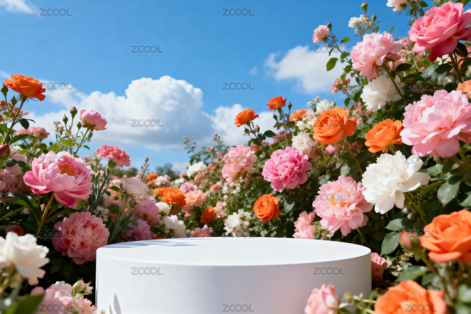 户外蓝天白云下粉色鲜花围绕电商产品展示台