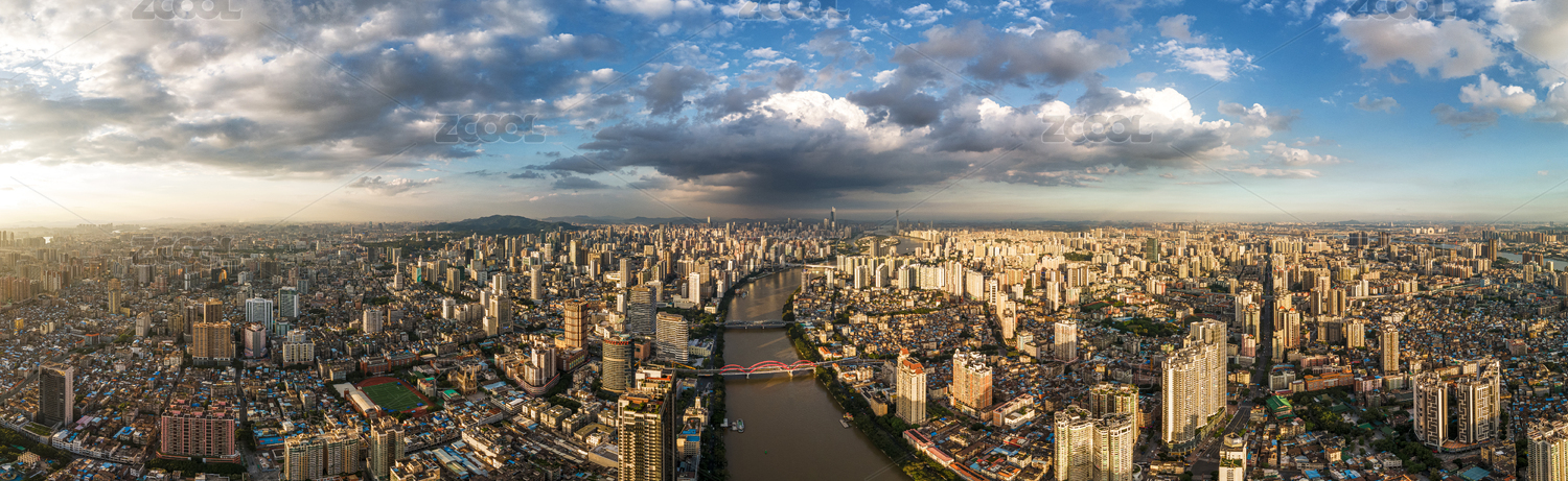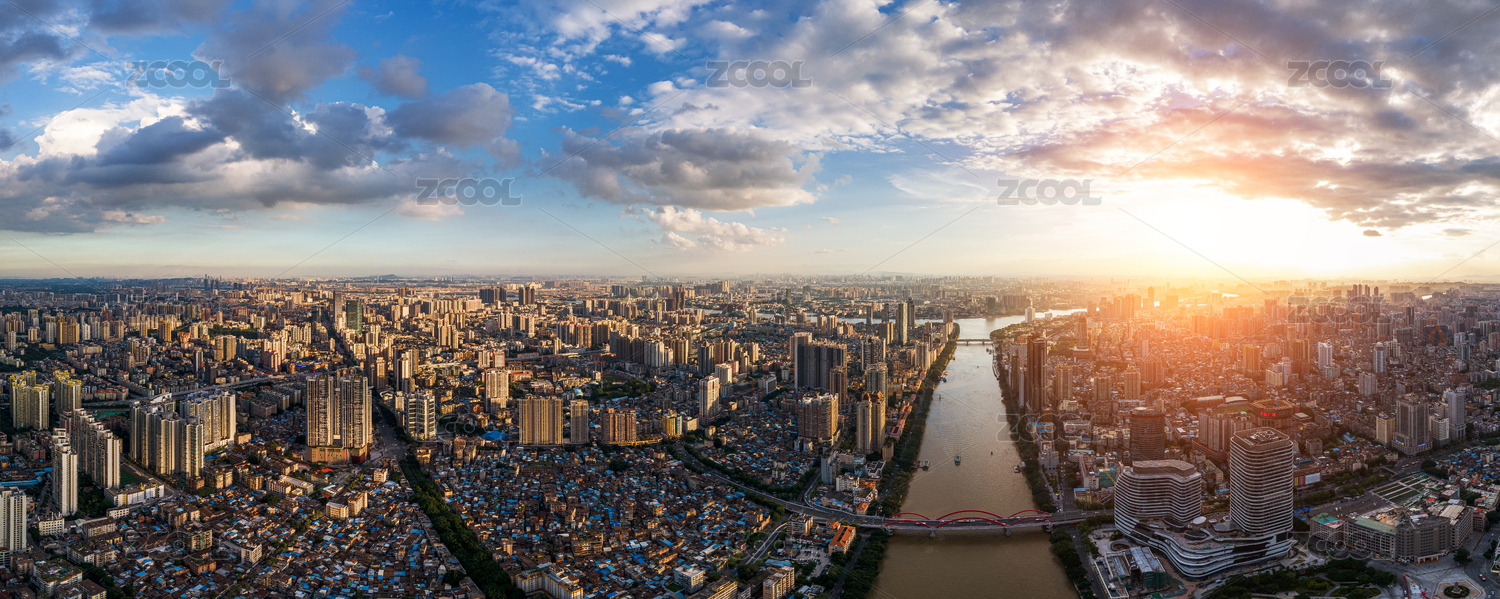 中国,广东,广州,珠江,珠江两岸,日落,黄昏,天际线,老城区,航拍