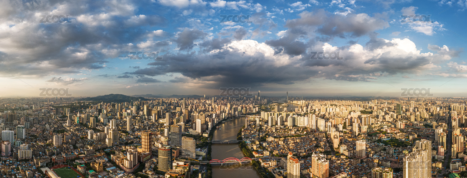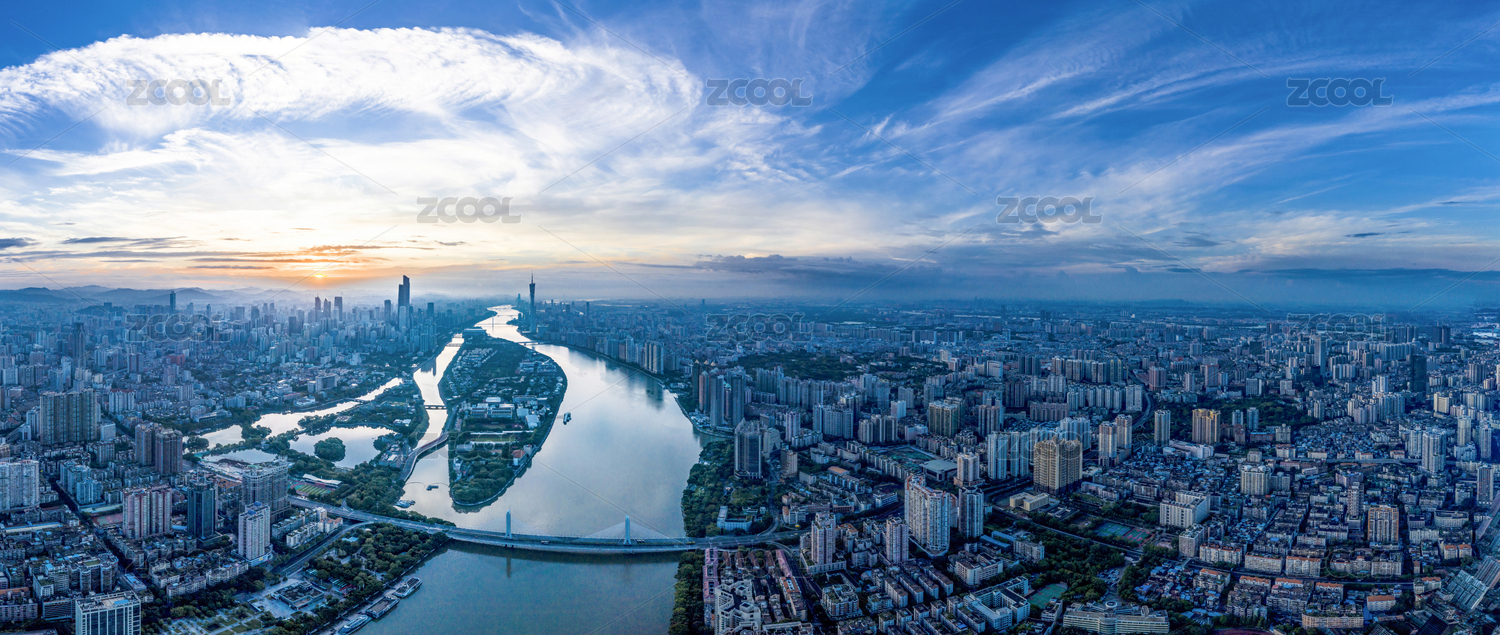 航拍广州珠江两岸城市天际线日落黄昏全景