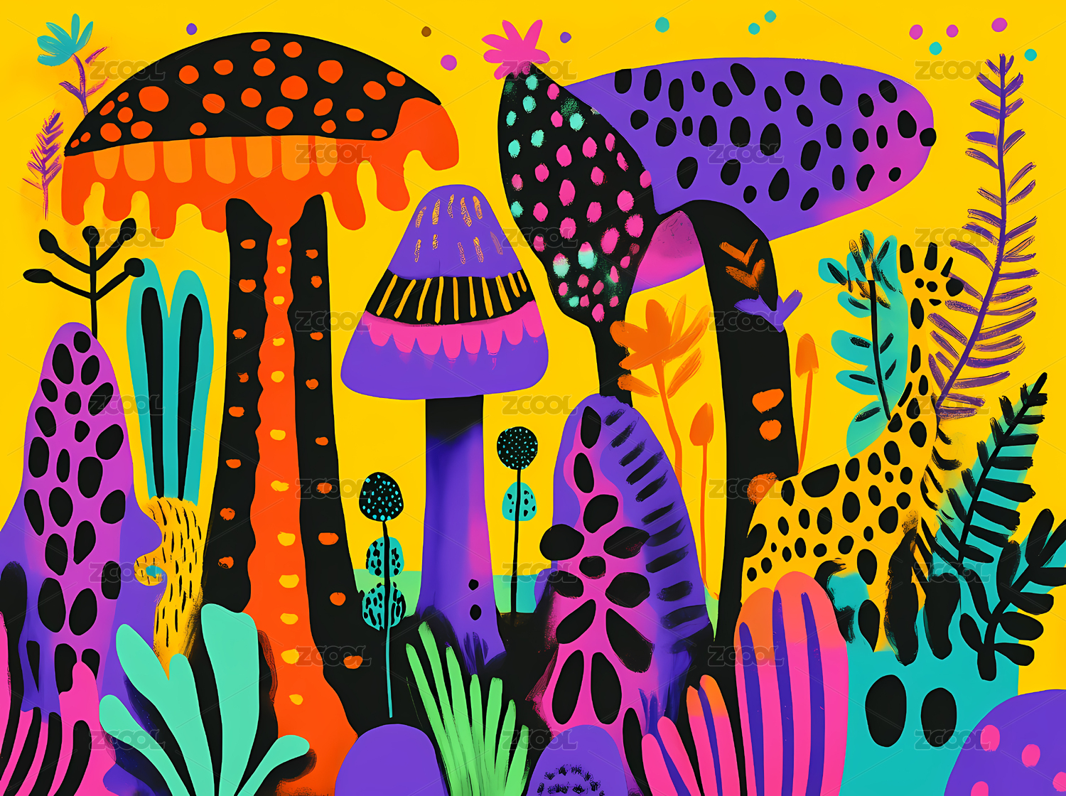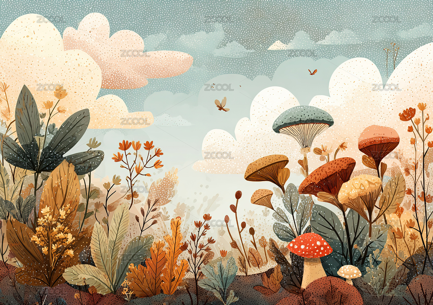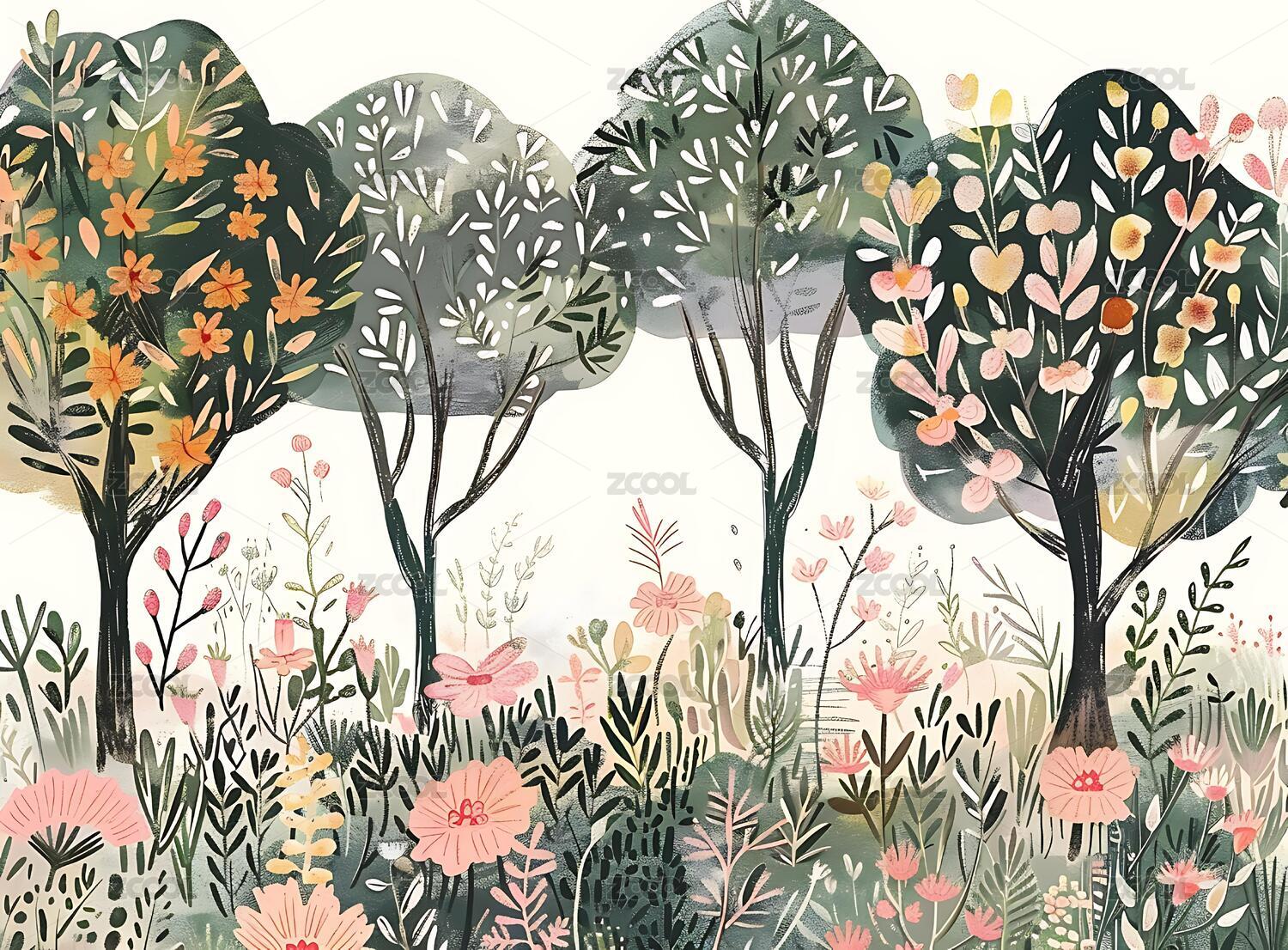 树,花,开花植物,艺术,蘑菇,水彩风,植物,植物群,草,儿童插画