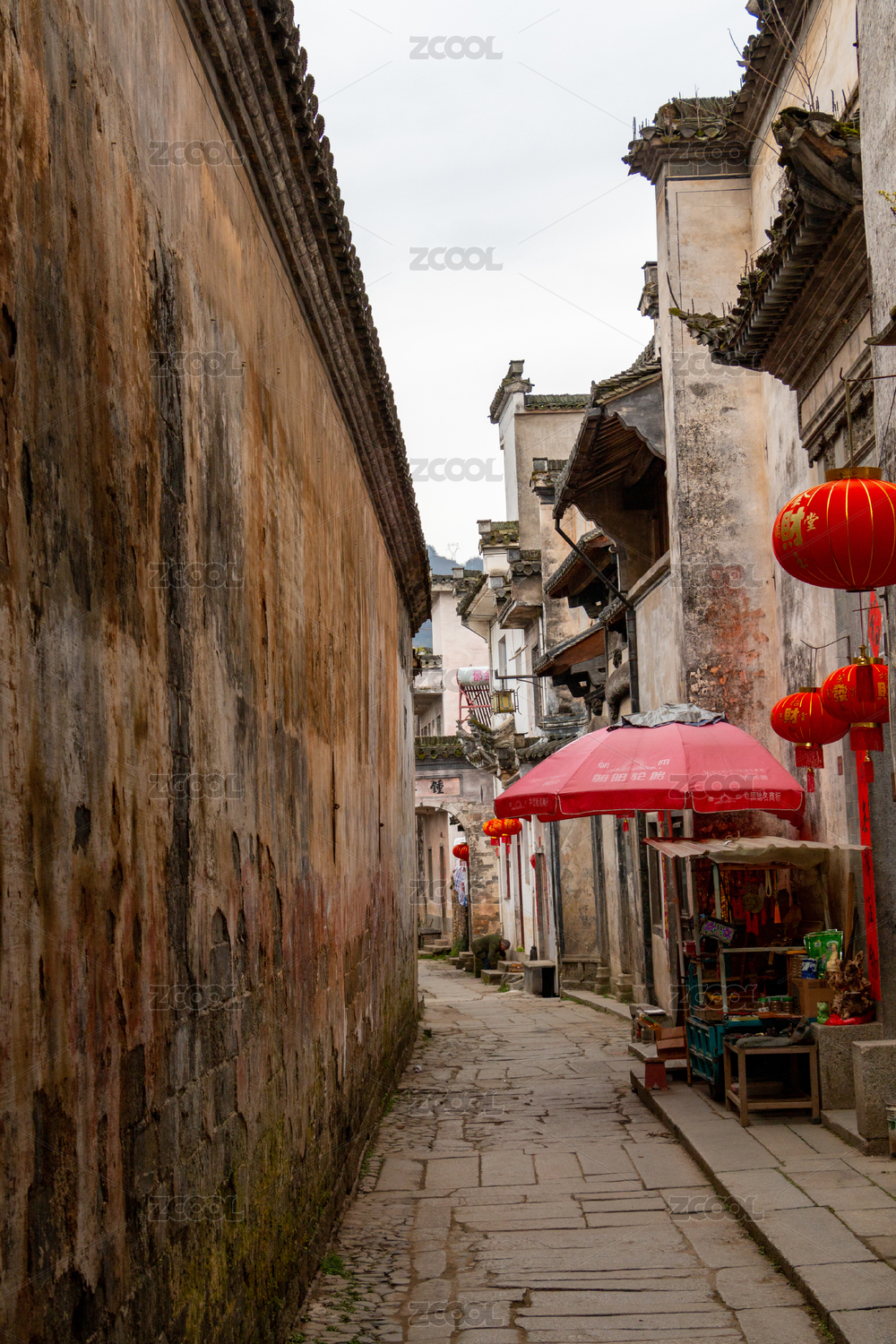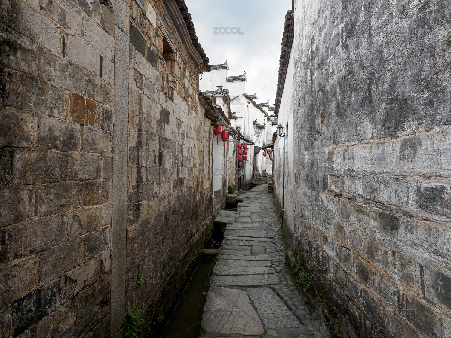 安徽黄山宏村徽派古典建筑的青石板路巷子