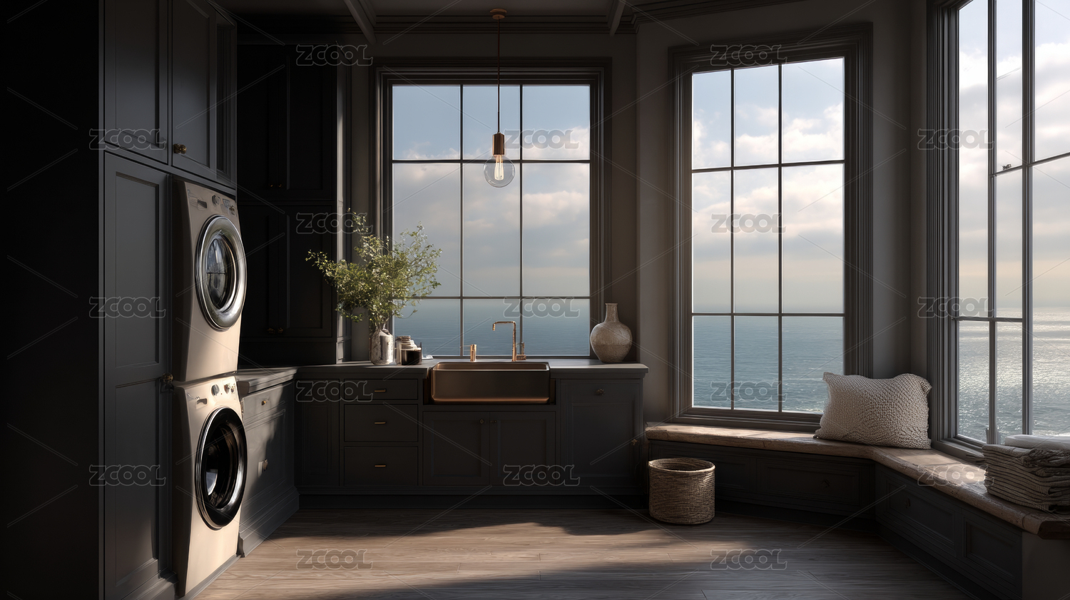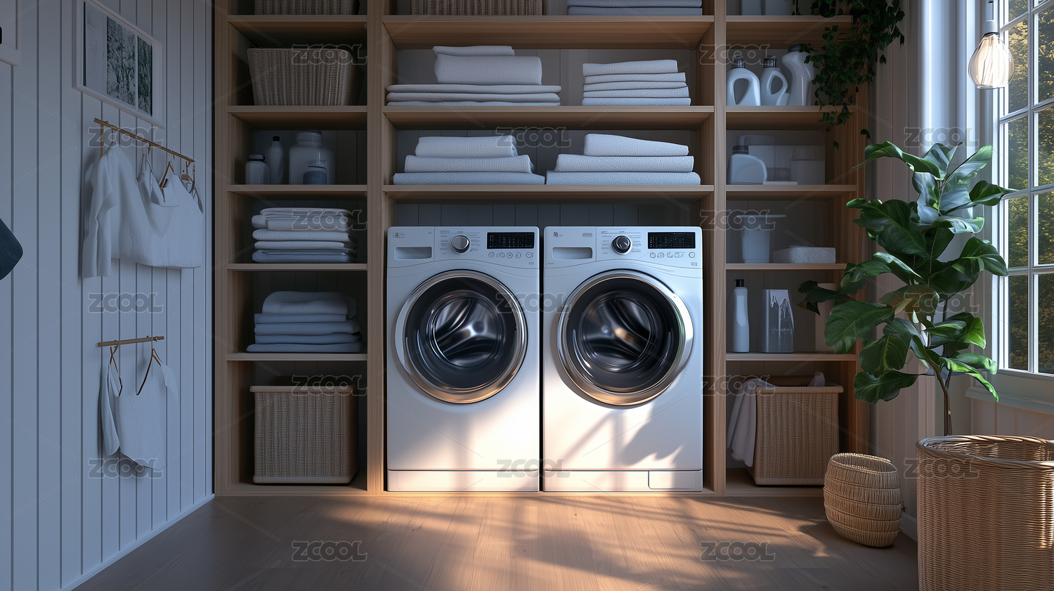 现代简约风格的洗衣房,配有浅色木质橱柜