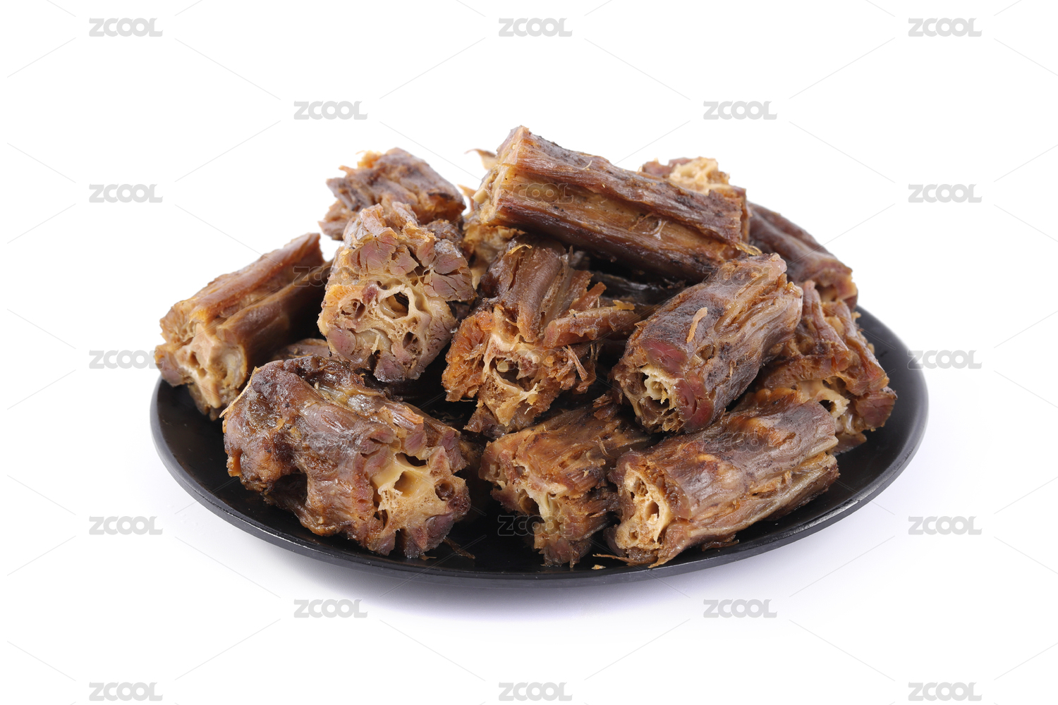 白色背景上餐具中摆放的麻辣鸭脖