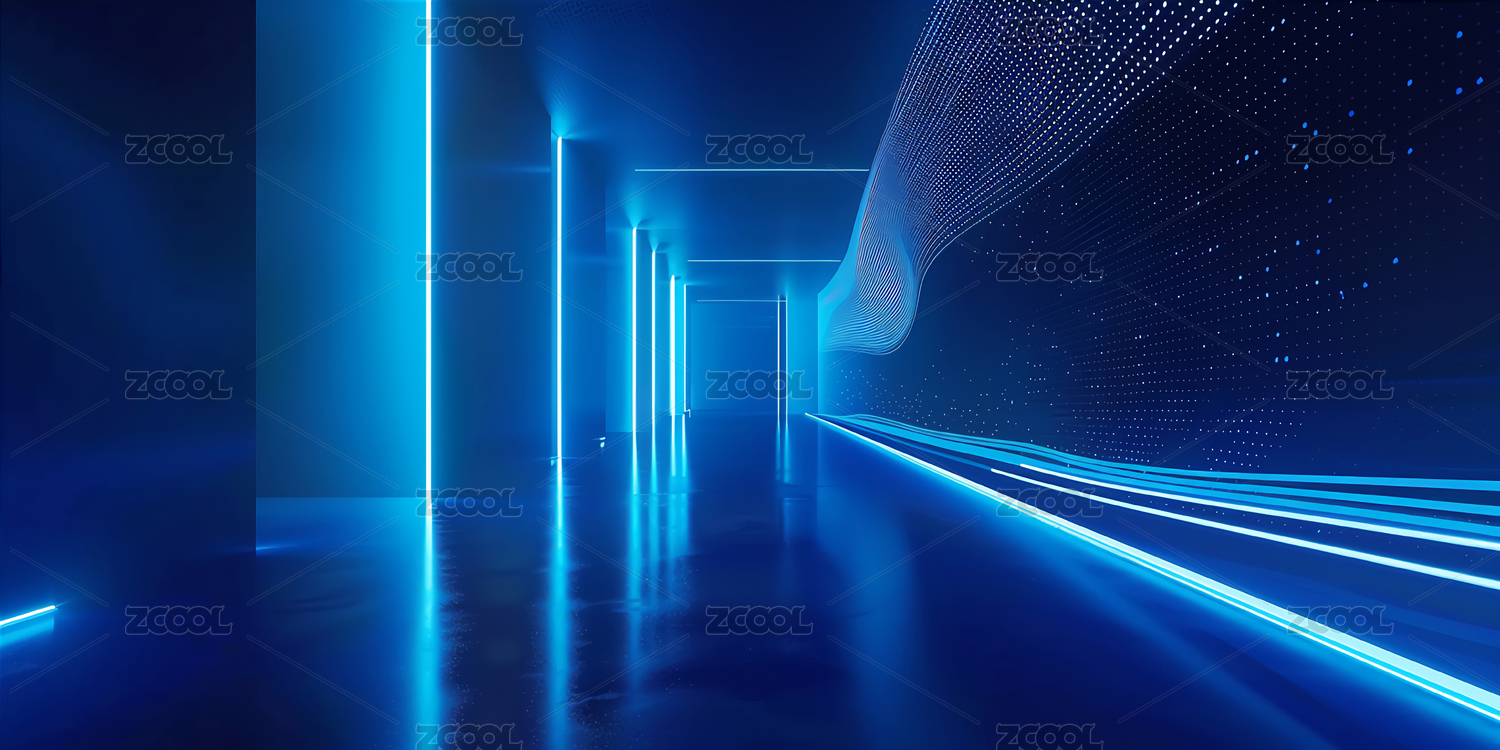 现代,极简,三维,场景,光影,光束,灯带,蓝色,科技,空间
