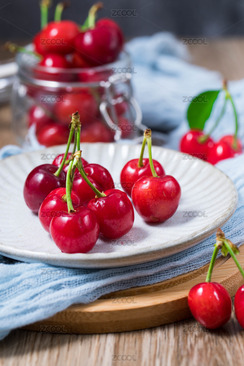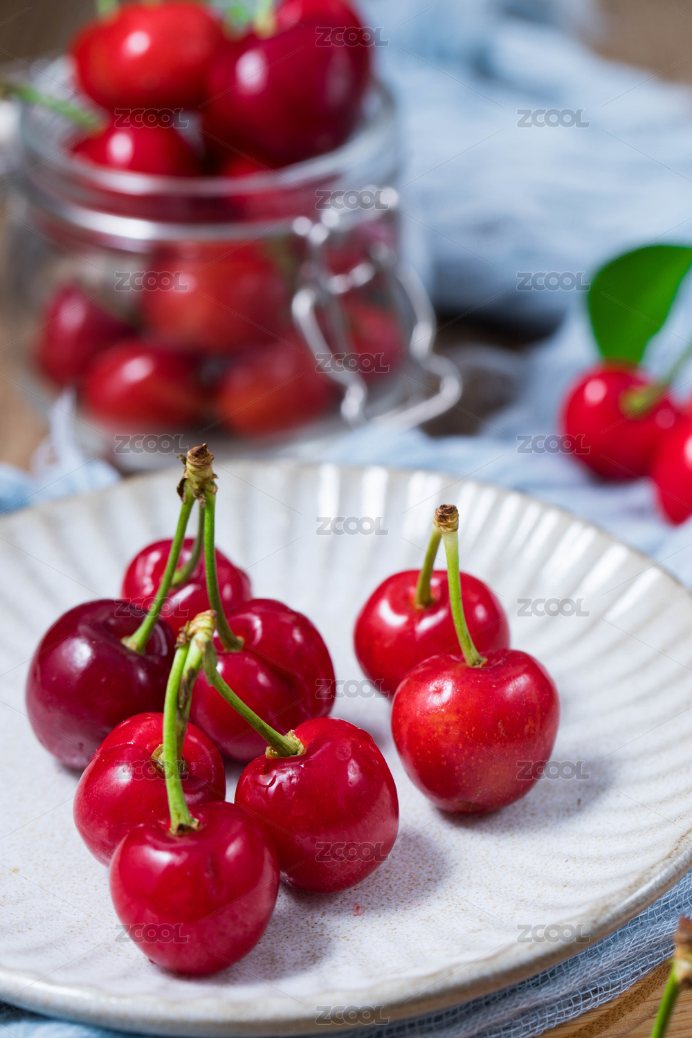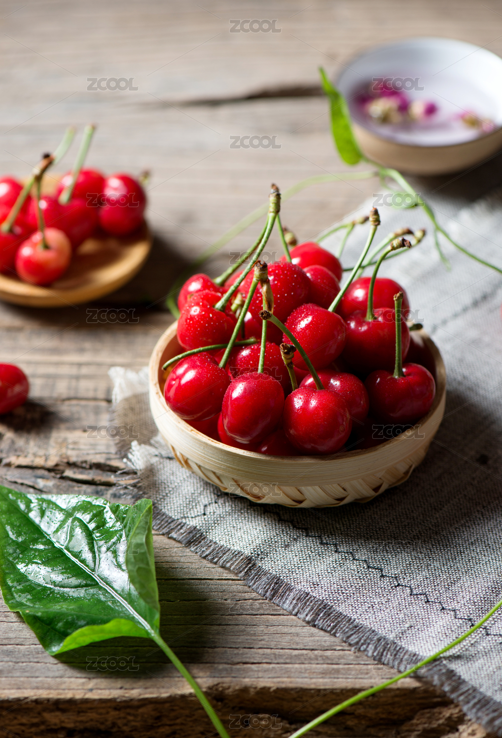 放在深色瓷碗和中式竹蓝里的红樱桃