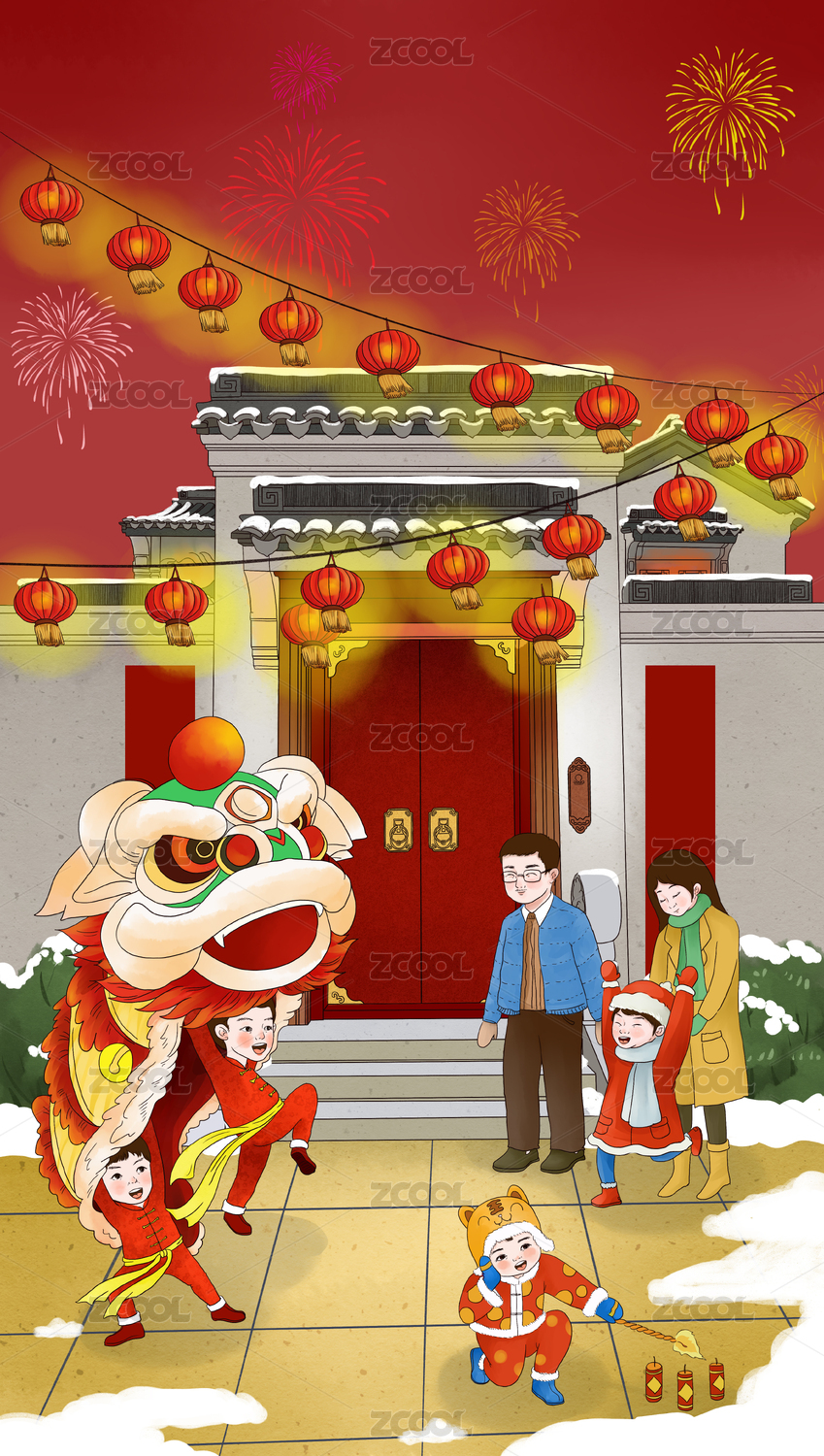 欢度春节除夕舞狮扭秧歌喜庆贺图