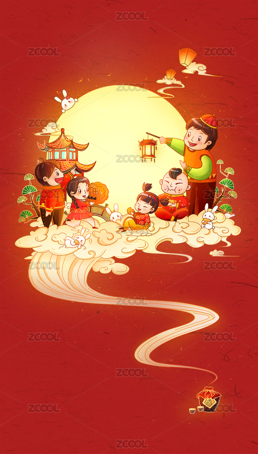 中秋节儿童和兔子吃月饼喜庆国风插画