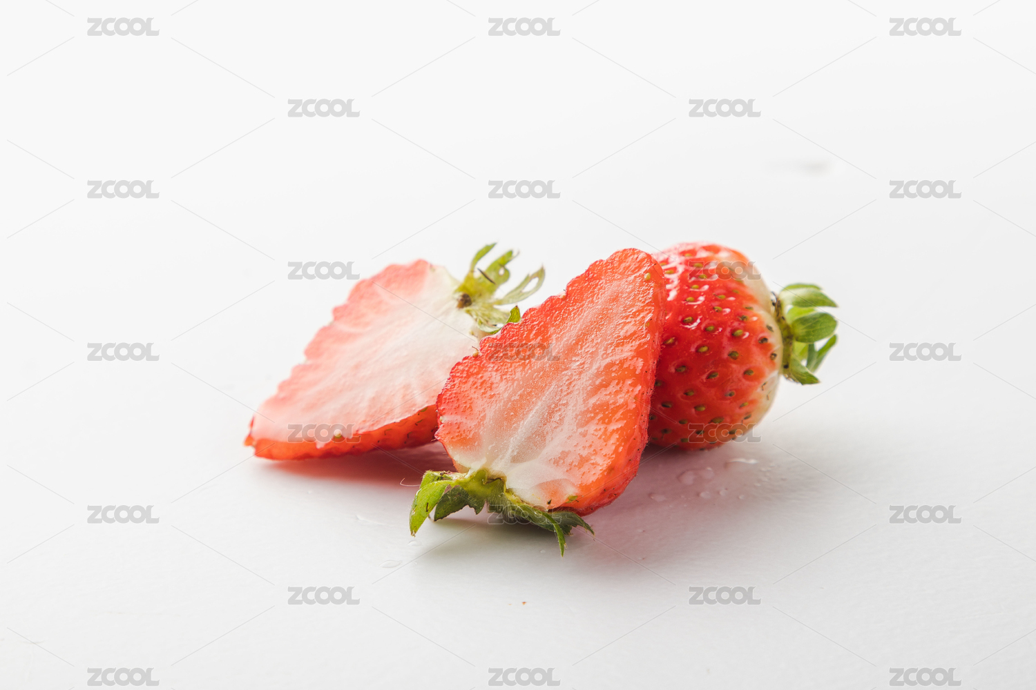 白色桌面上放着几颗切开的带着绿叶的草莓