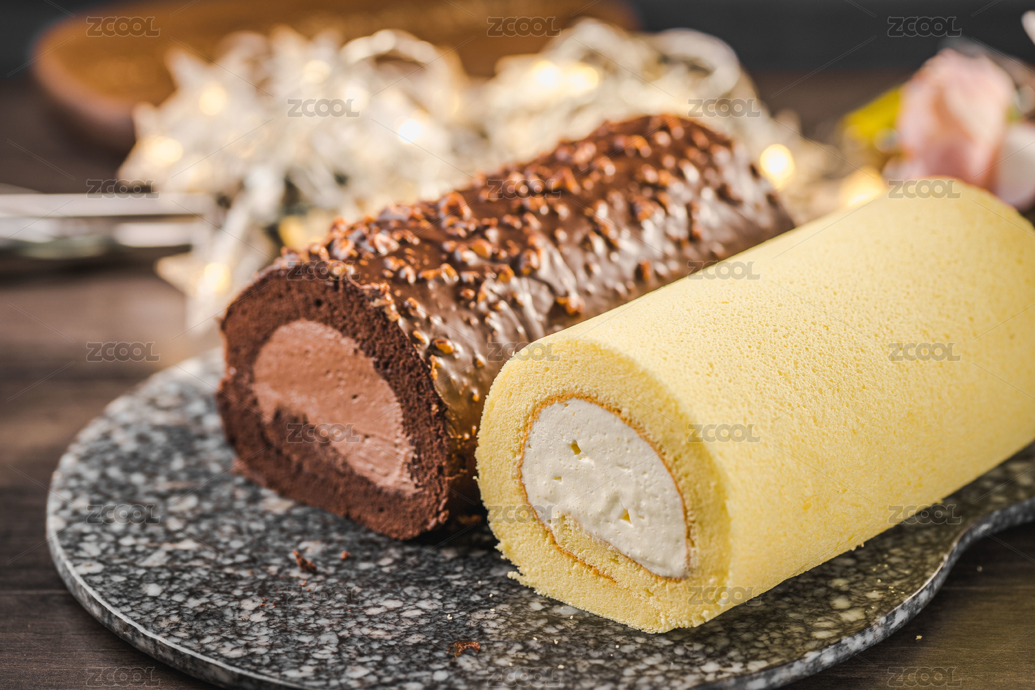 一盘鲜牛乳蛋糕卷摆放在桌面上特写