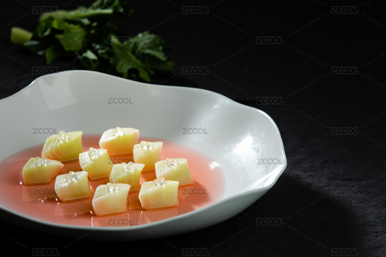 寿司帘上的圆瓷盘装的豌豆黄