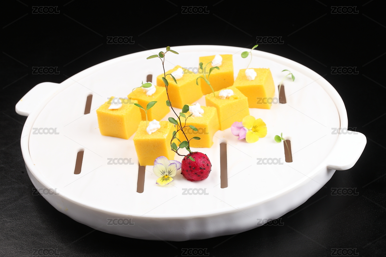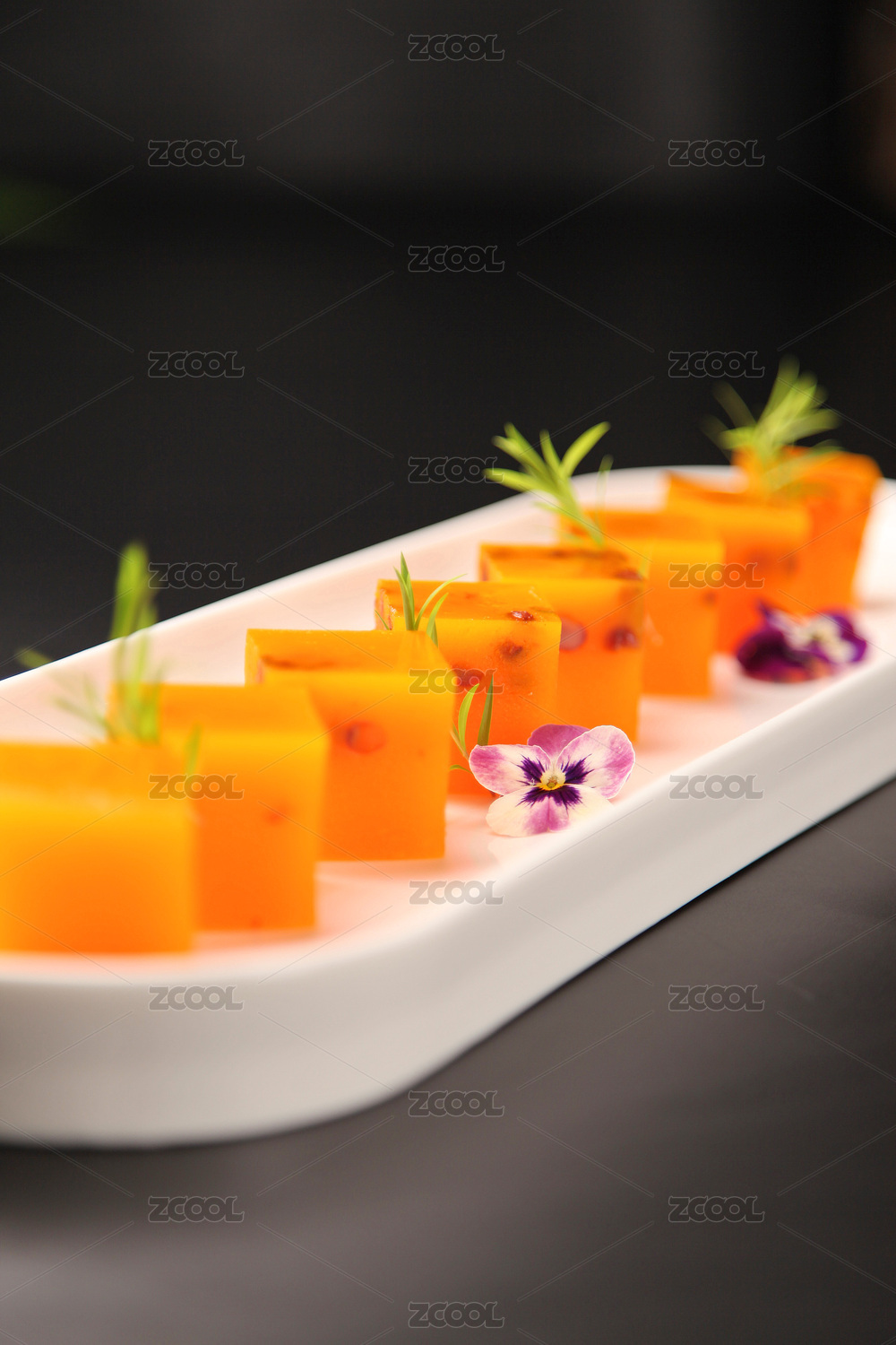 黑玻璃盘装的甜品芒果泥冻