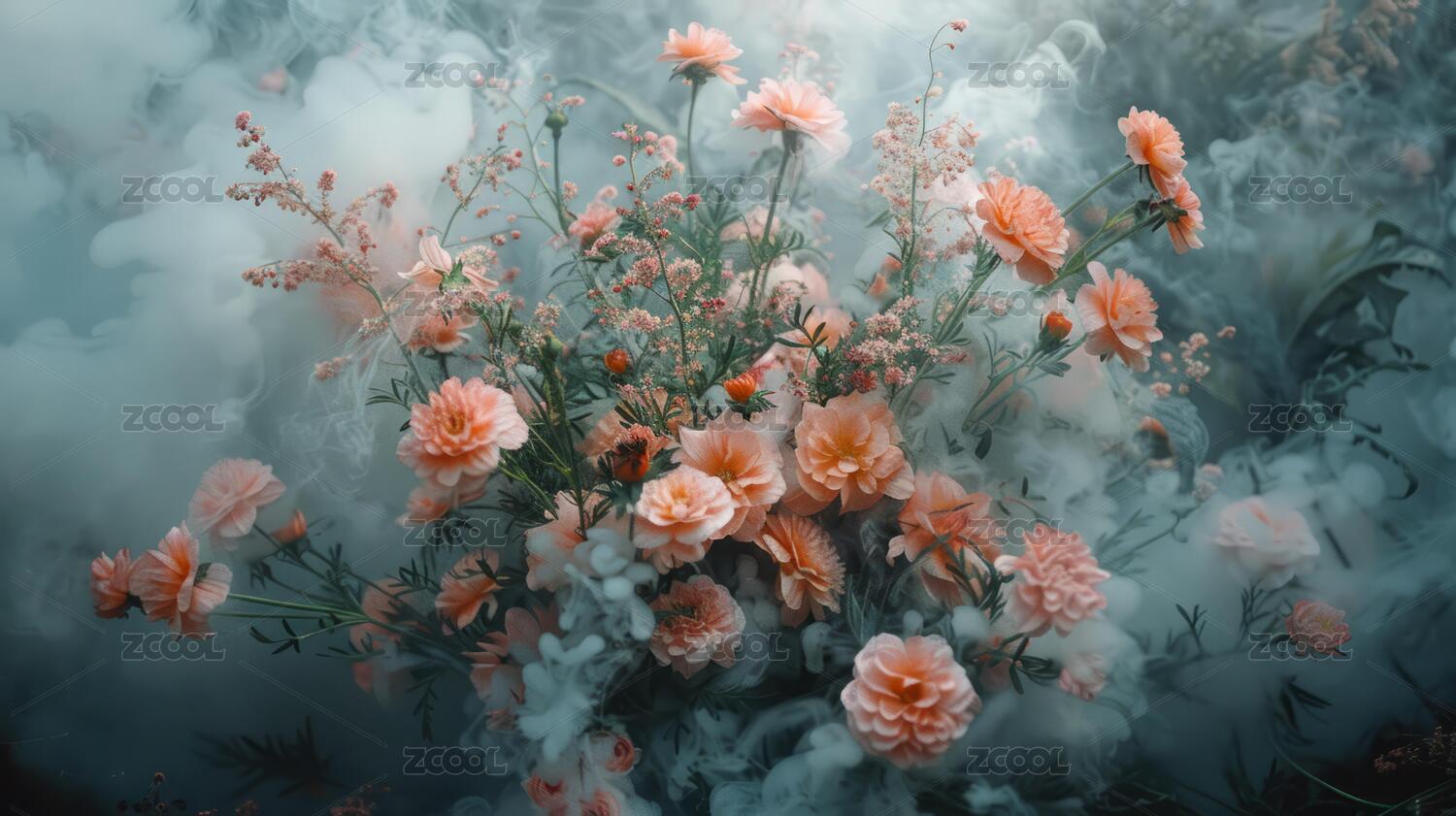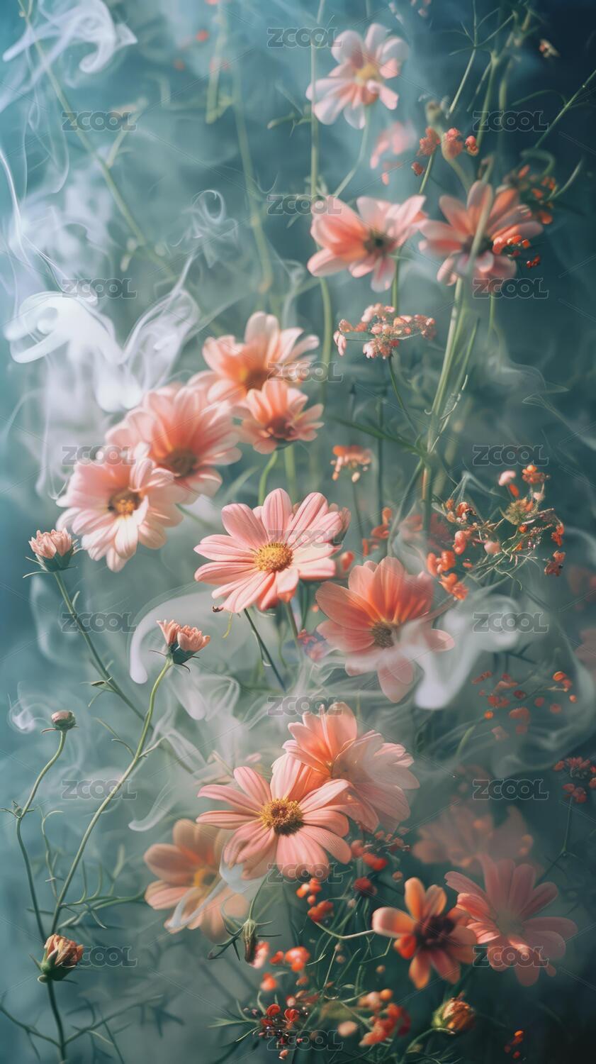 五彩缤纷的非洲菊在白色烟雾中的迷人景象