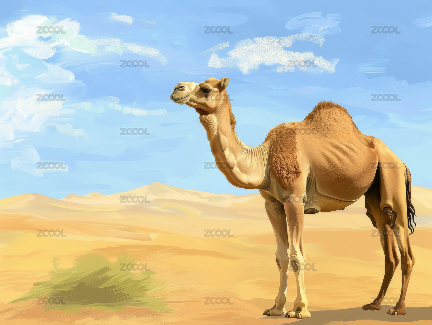 晴天明亮一匹沙漠中行走的单峰骆驼插画绘画