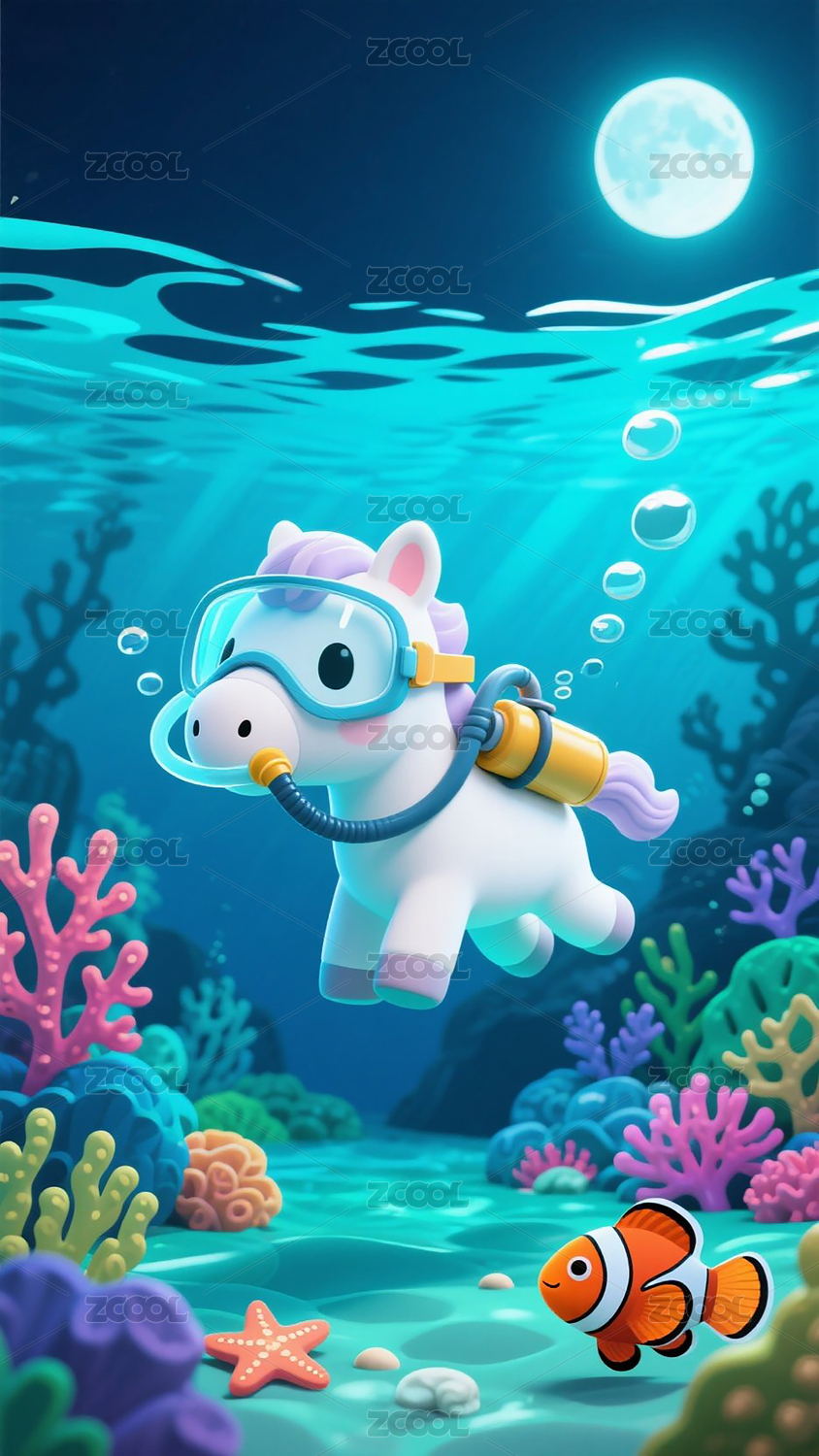 海底独角兽潜水梦幻卡通插画