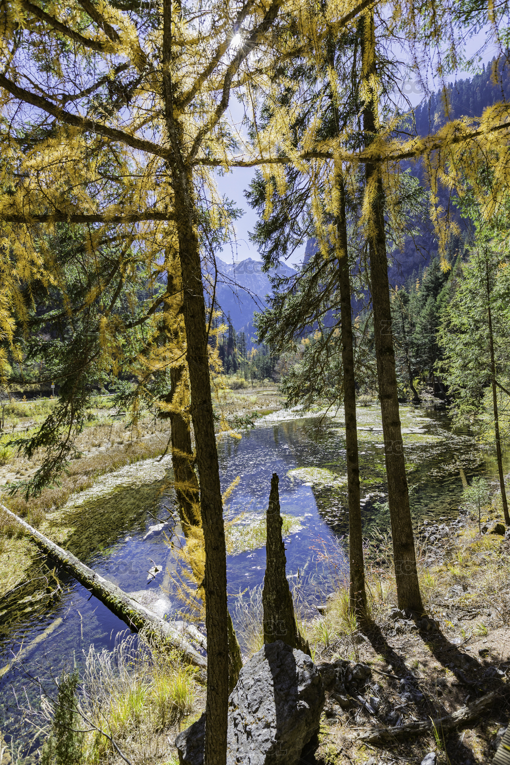 九寨沟风景区芳草海秋季彩林山水自然风光