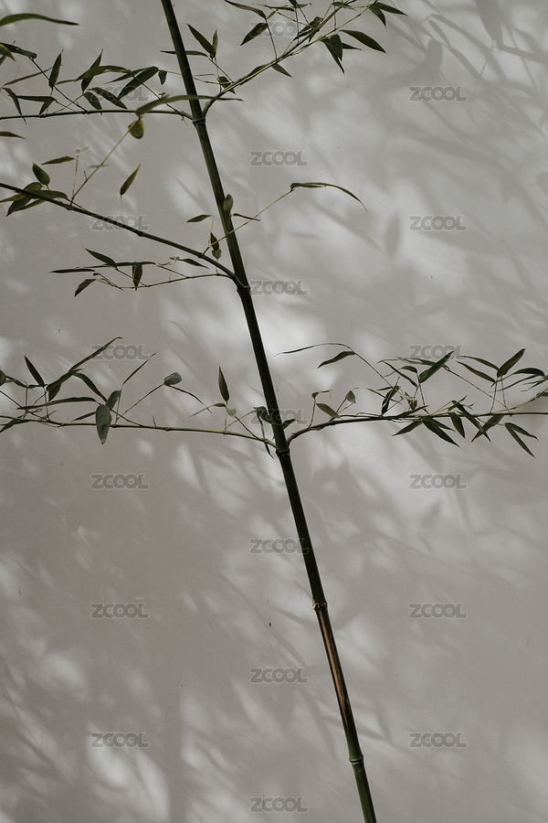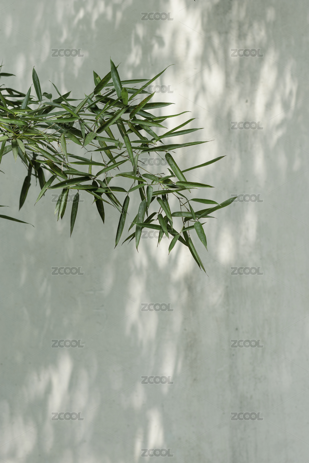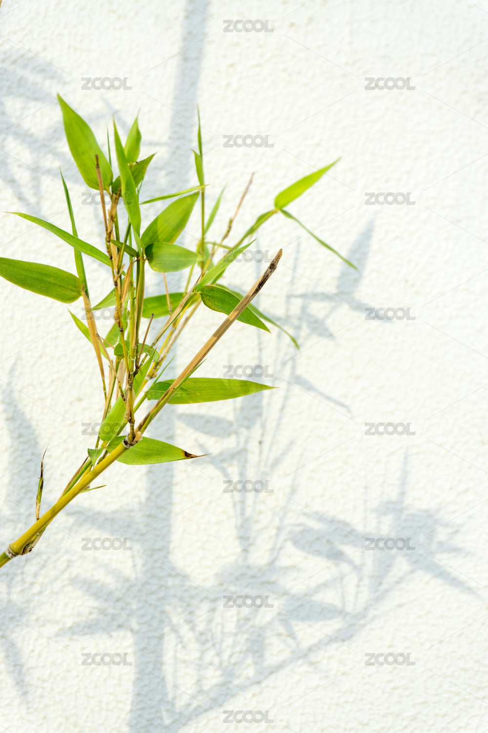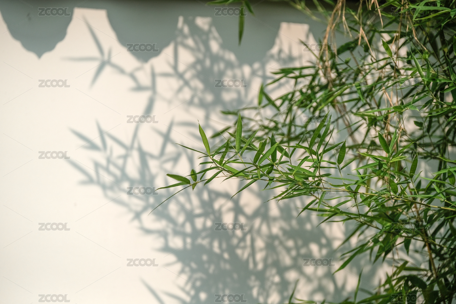 阳光下黄色墙壁上斑驳的竹叶影子和竹林