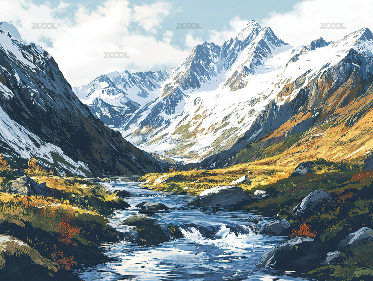 雪山秋景溪流风光