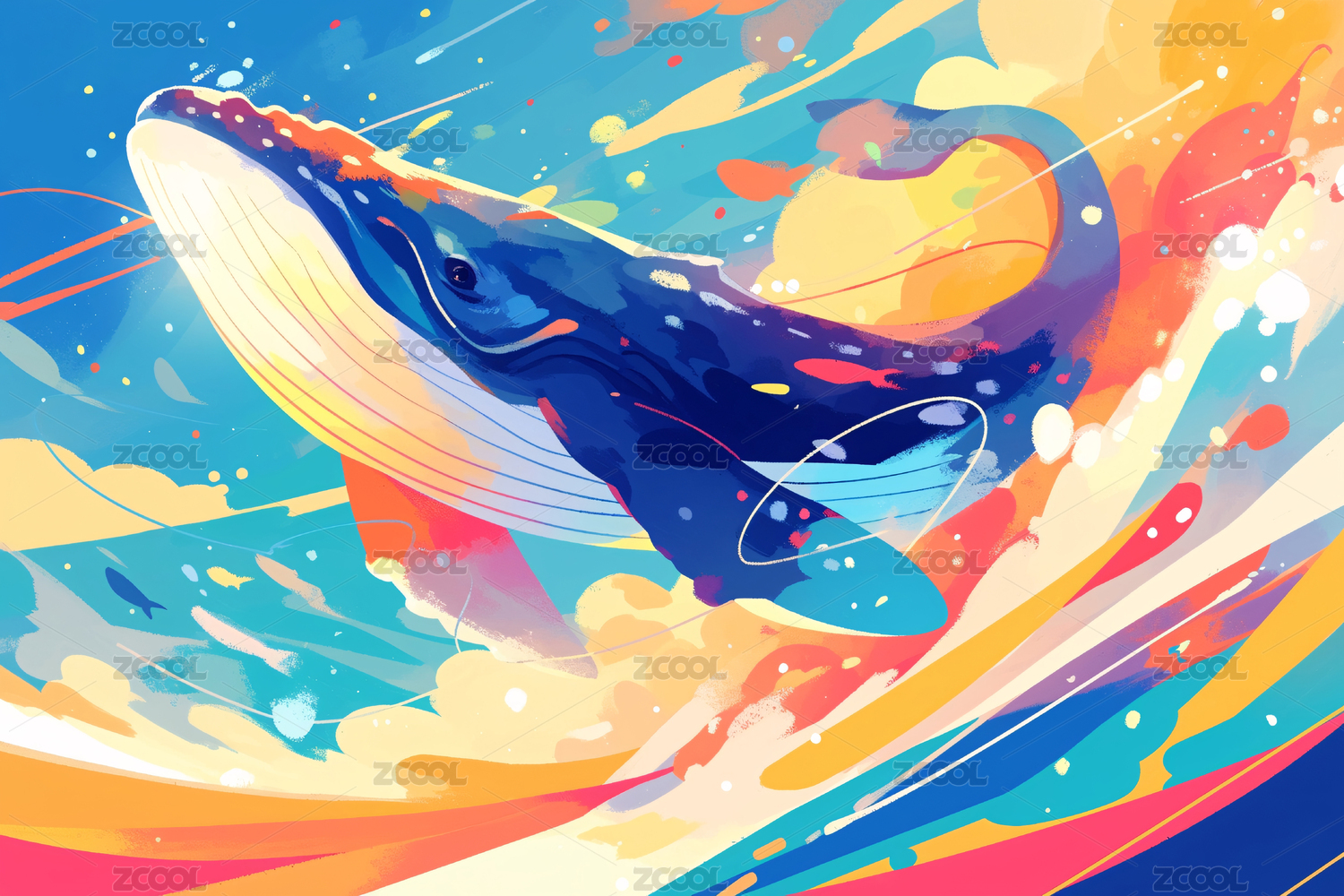划着船的女孩和鲸鱼在翻涌着的海浪上