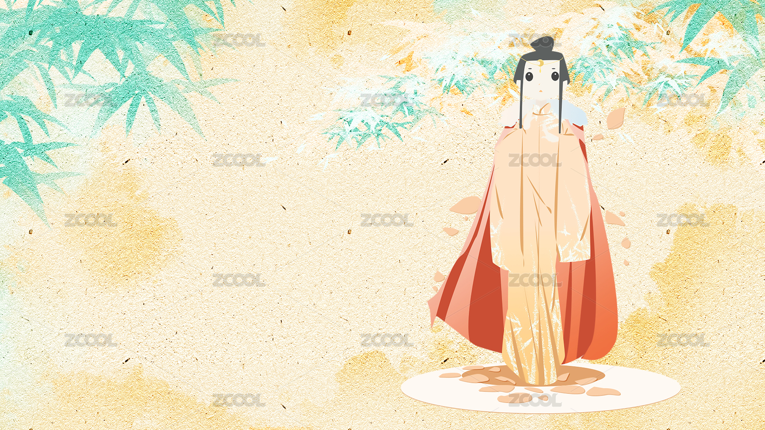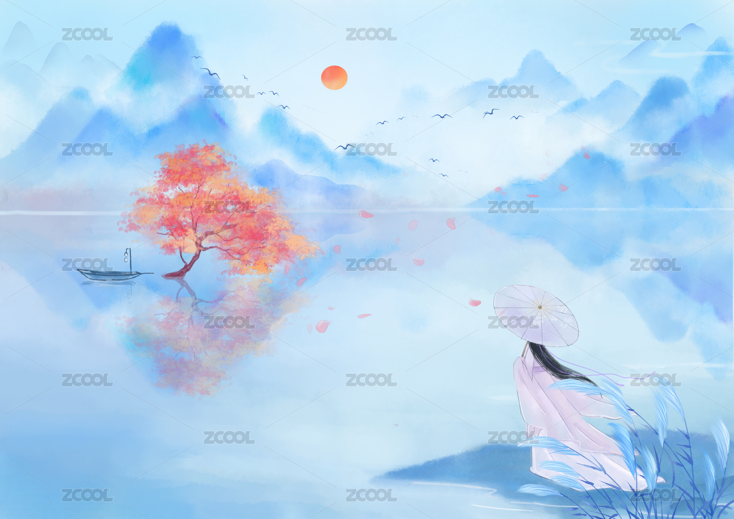 水墨风格古典诗词插画秋季里枯萎的荷花池塘仕女