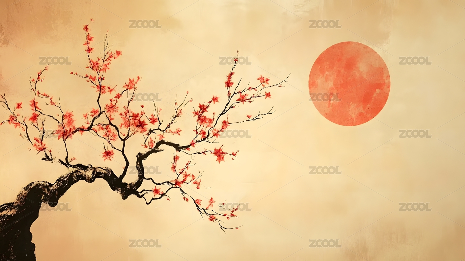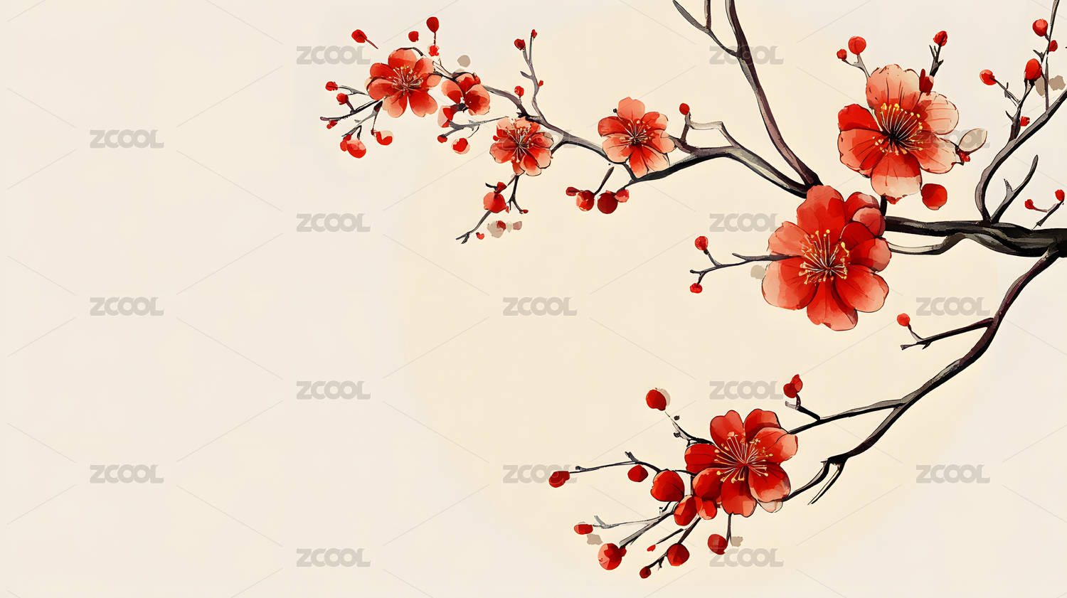 红色的花朵和树枝装饰,国风水墨画空背景