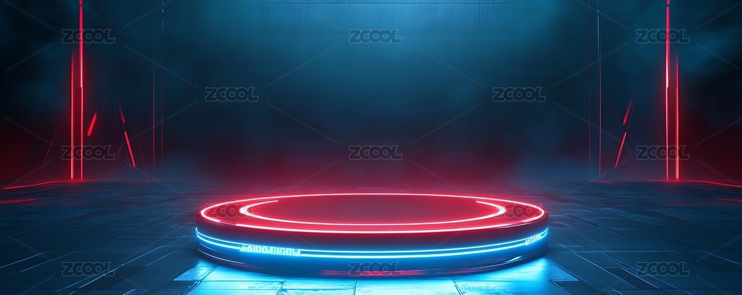 A hexagonal-shaped stage with a circular podium in the center, illuminated by blue and red lights. The background is composed of dark gray honeycomb patterns. There's an empty space on top for product display. This scene creates a futuristic atmosphere th