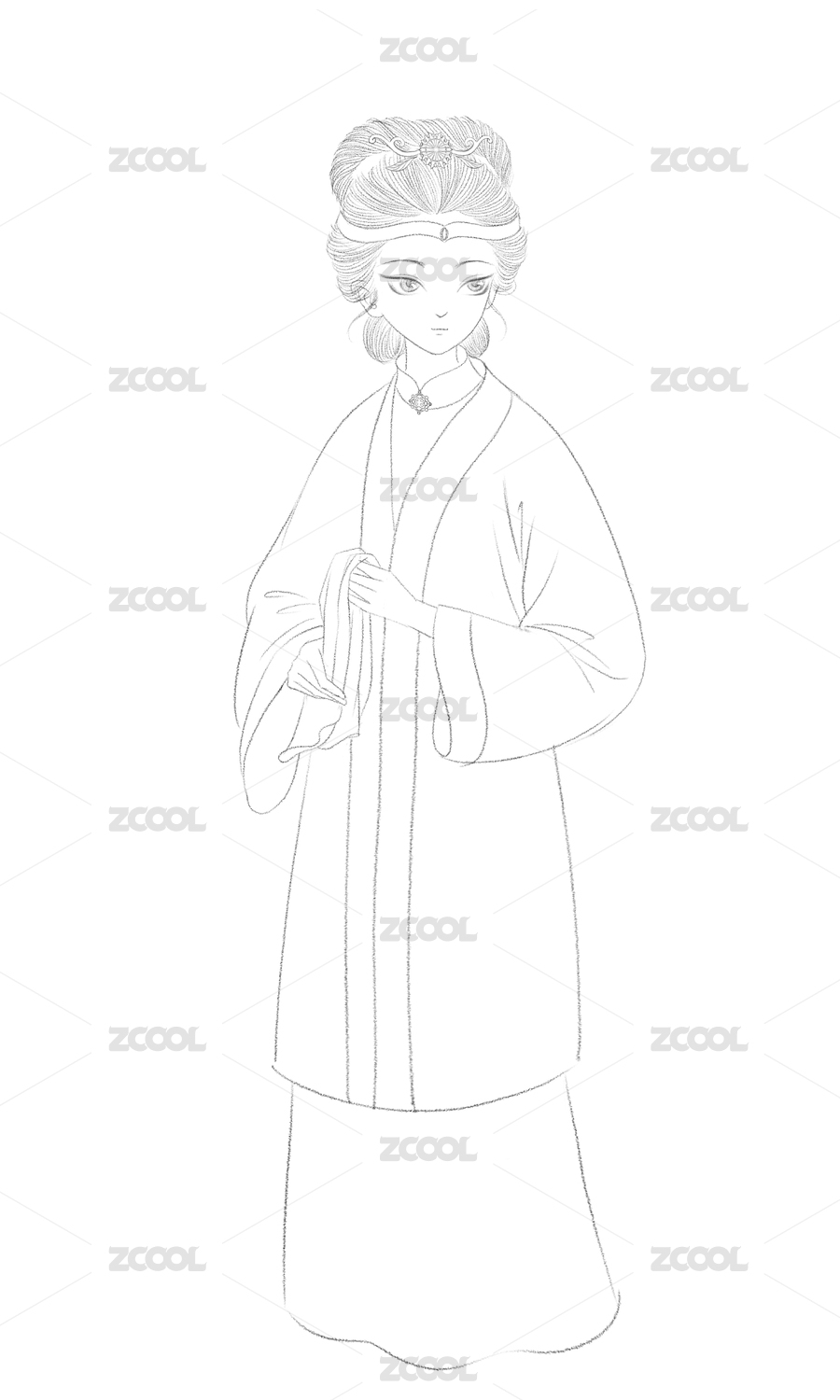 国画工笔白描人物古装侍女
