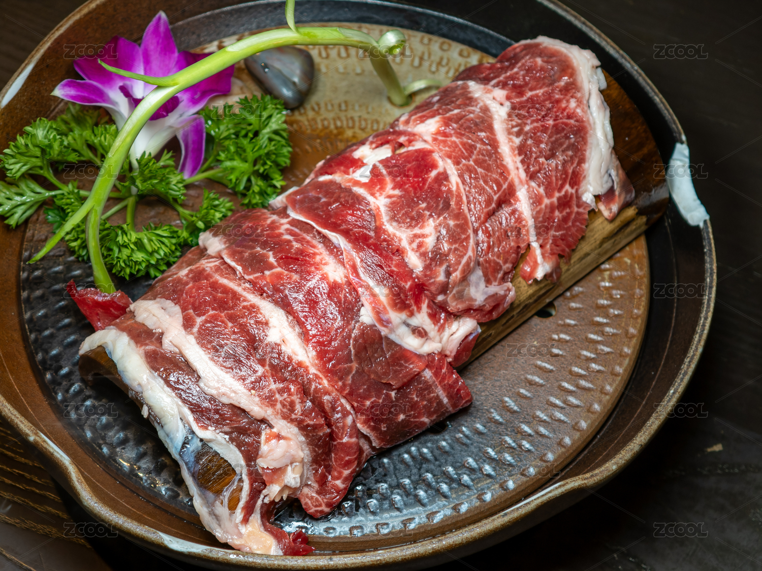 盘子上拥有美丽大理石花纹的新鲜生牛肉
