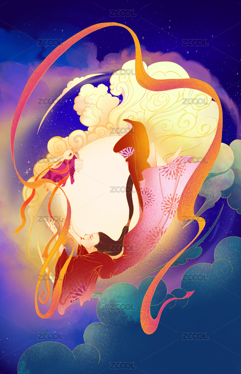中秋节飞天仙女嫦娥奔月中国风插画背景