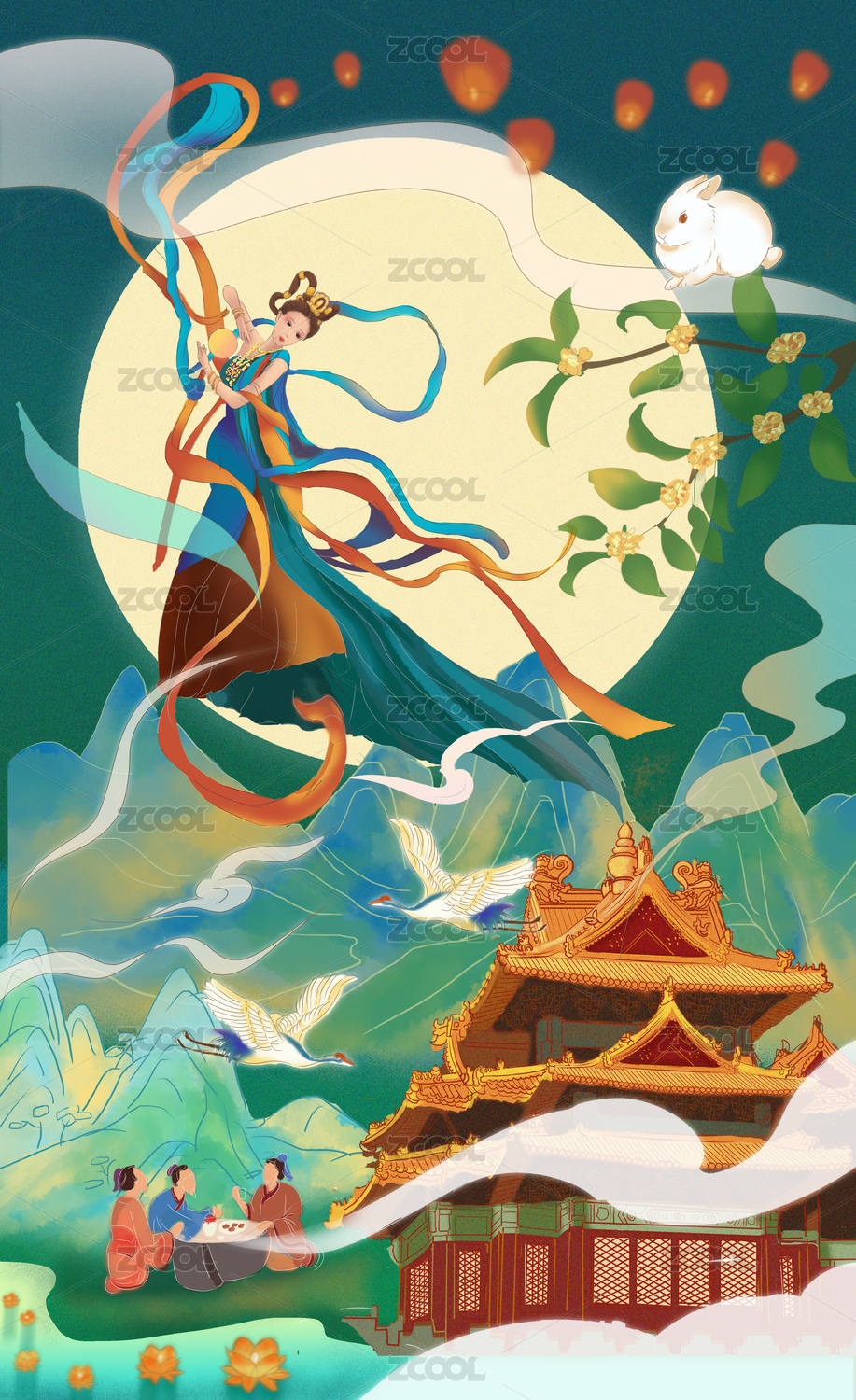 中秋节中国传统文化嫦娥奔月典故矢量插画