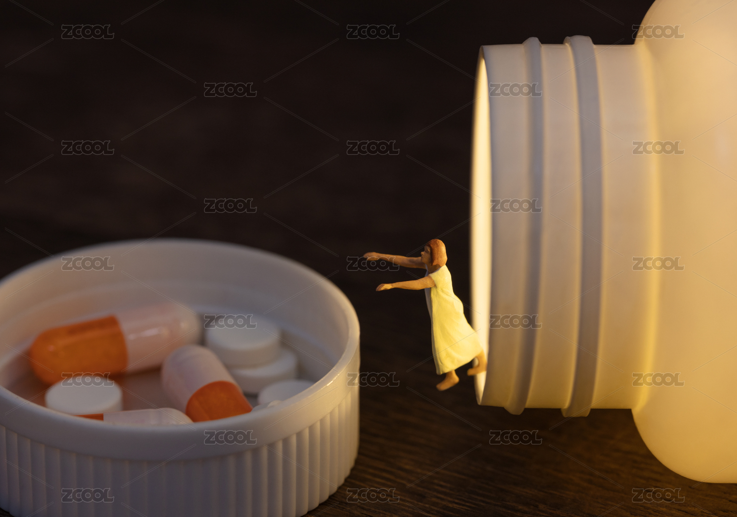 微缩创意发光的药瓶与失眠梦游的女性
