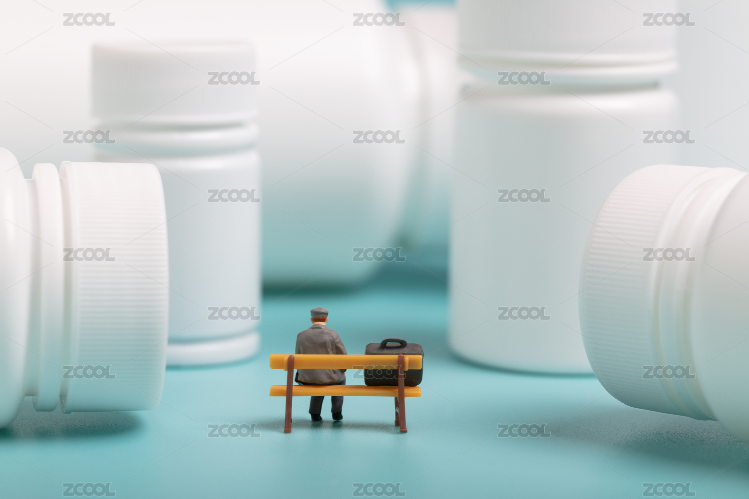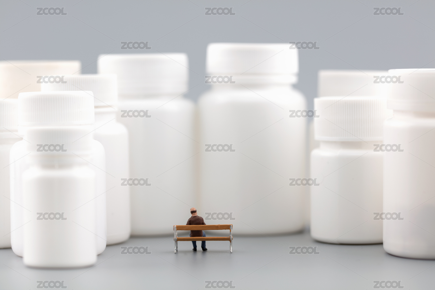 微缩创意白色药瓶坐在长椅上孤独的男性