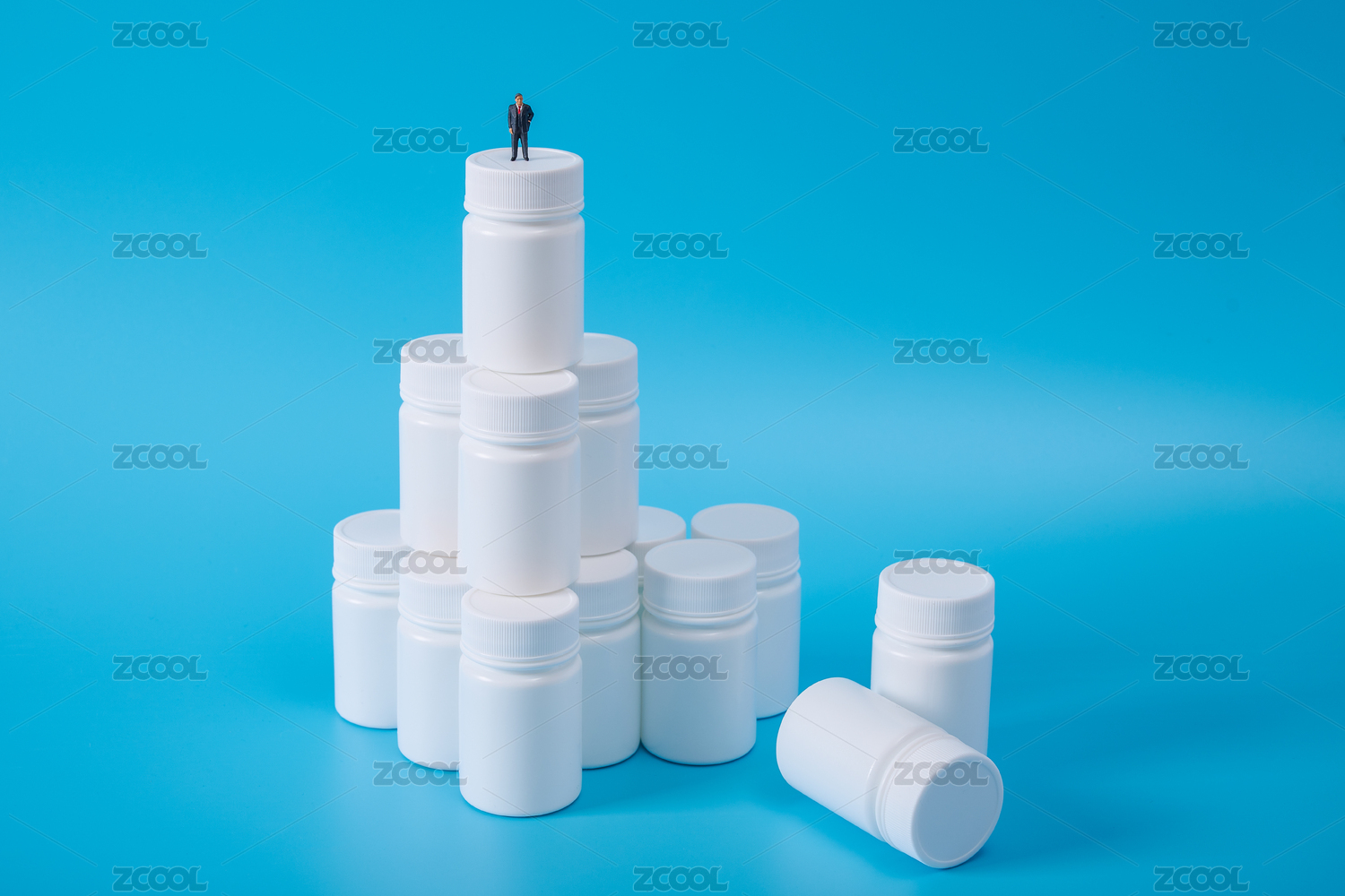 微缩创意攀爬药瓶在蓝背景上