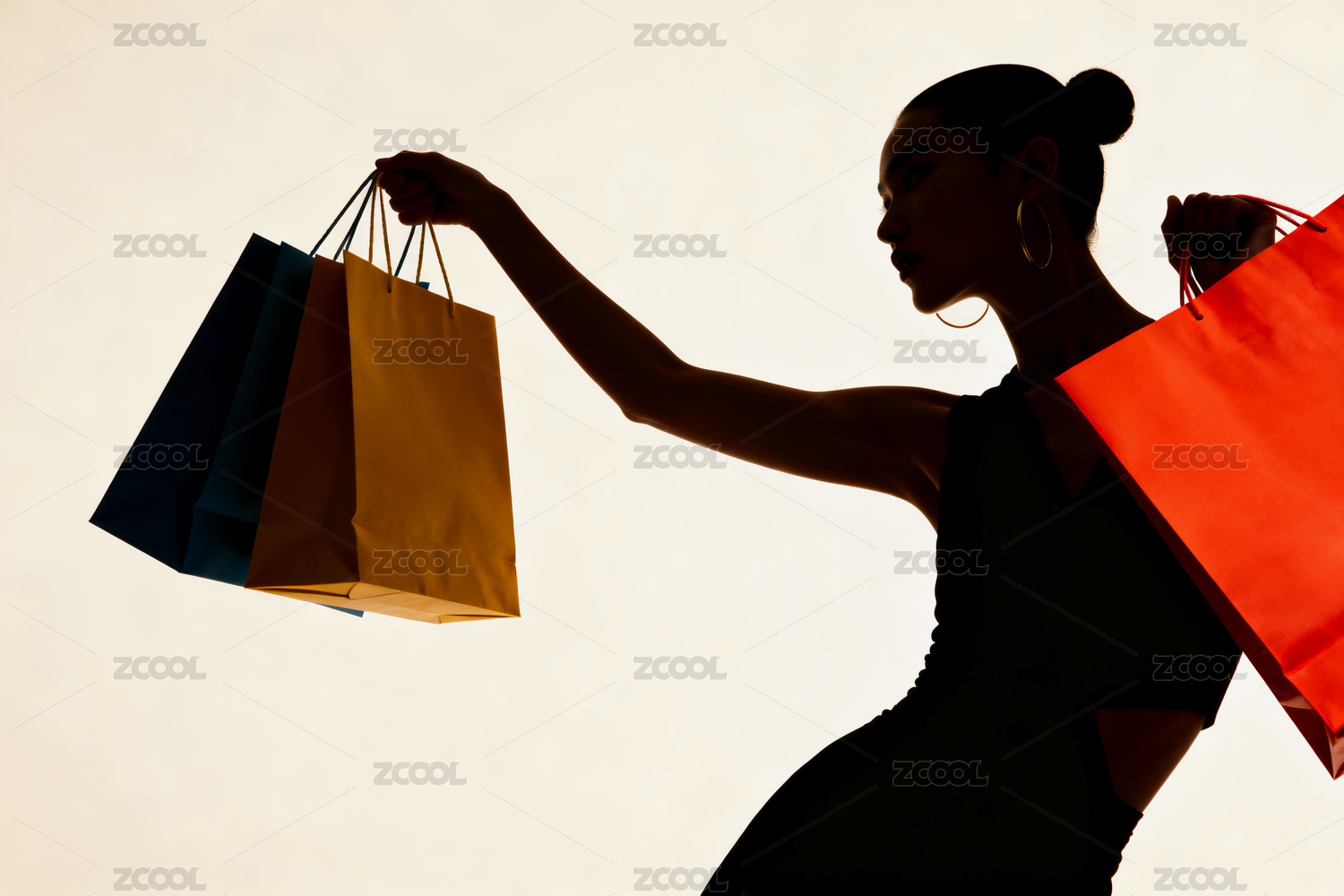 快乐购物的女人与五彩购物袋开朗购买的商品多为自己庆祝白墙上COPYSPACE背景节日。